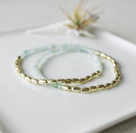 These Kindred Duo Bracelets-come in a stunning variety of options, mother of pearl in either gold or silver, pink opalite with with gold, as well as amazonite with silver + gold.- bracelet set (includes 2 separate bracelets). Great to add to any stack, on their own and makes a great gift as well.