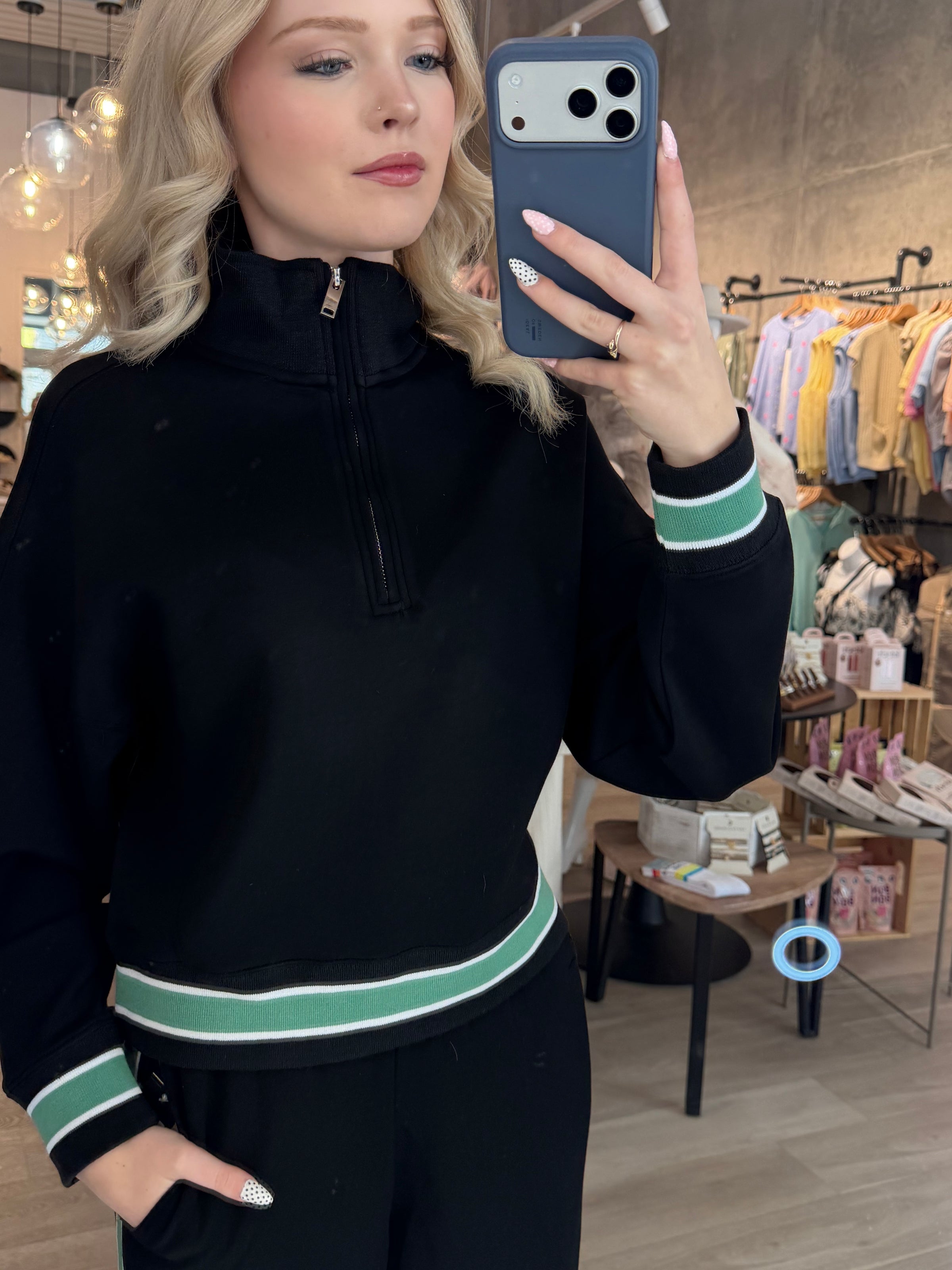 The Marilyn Quarter Zip by RD Style is your new go-to for effortless style and comfort. Crafted from luxuriously soft scuba fabric with just the right amount of stretch, this black pullover features a chic quarter-zip high mock neckline and eye-catching green stripe detailing. Perfect on its own with leggings or denim, or paired with the matching super-soft pull-on Marilyn Pants, it effortlessly elevates your everyday look.