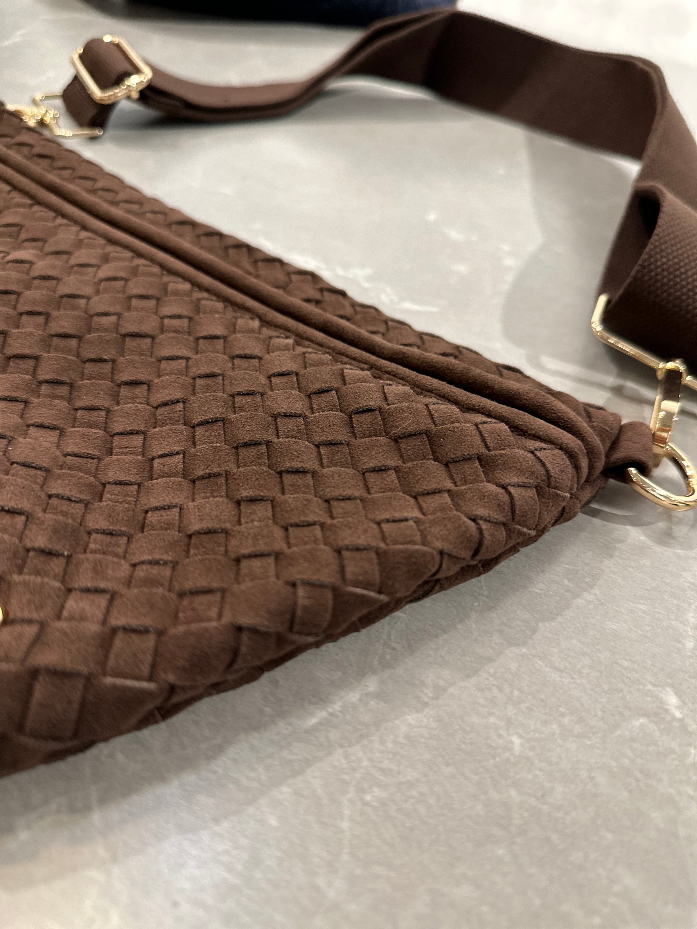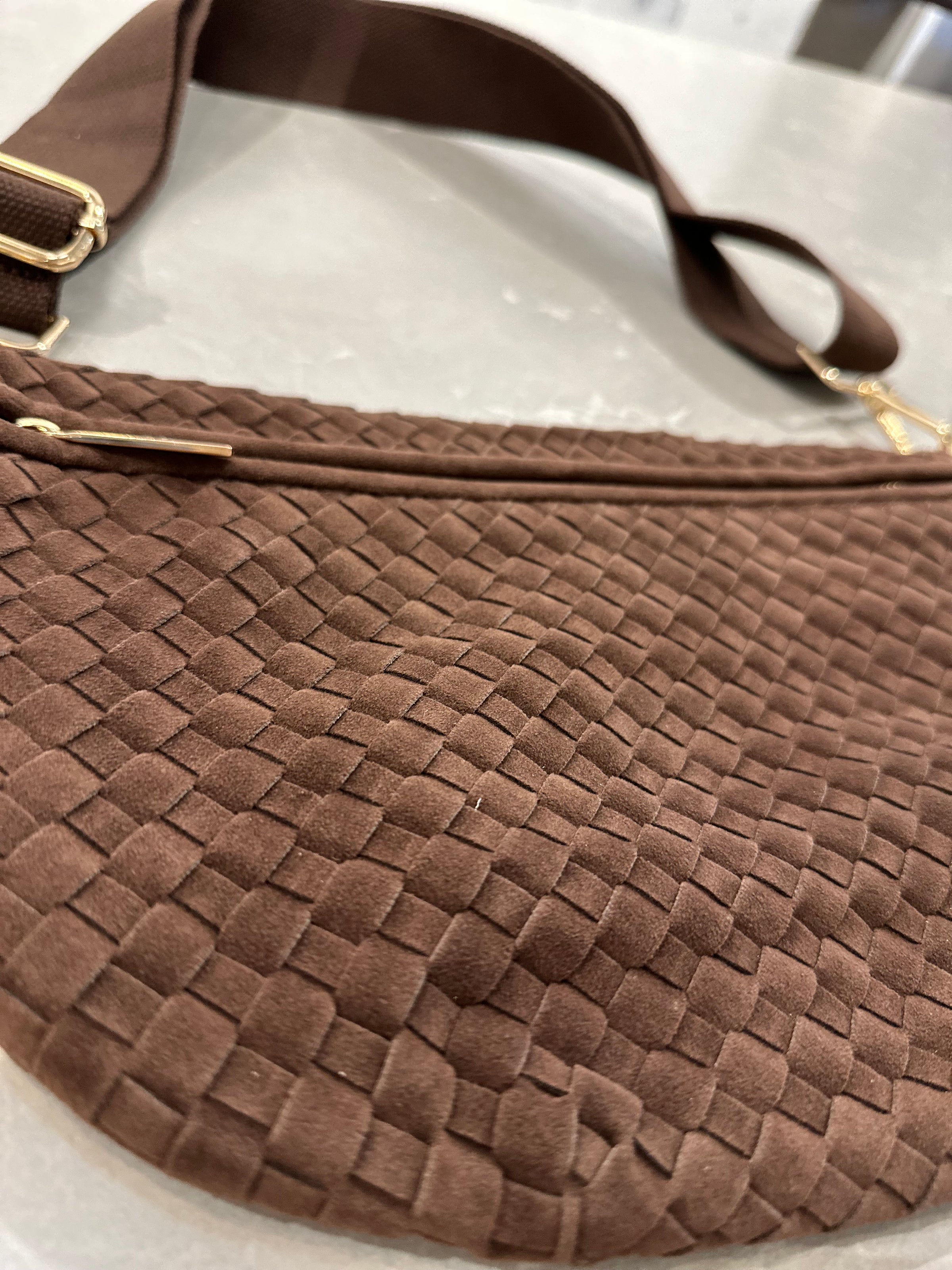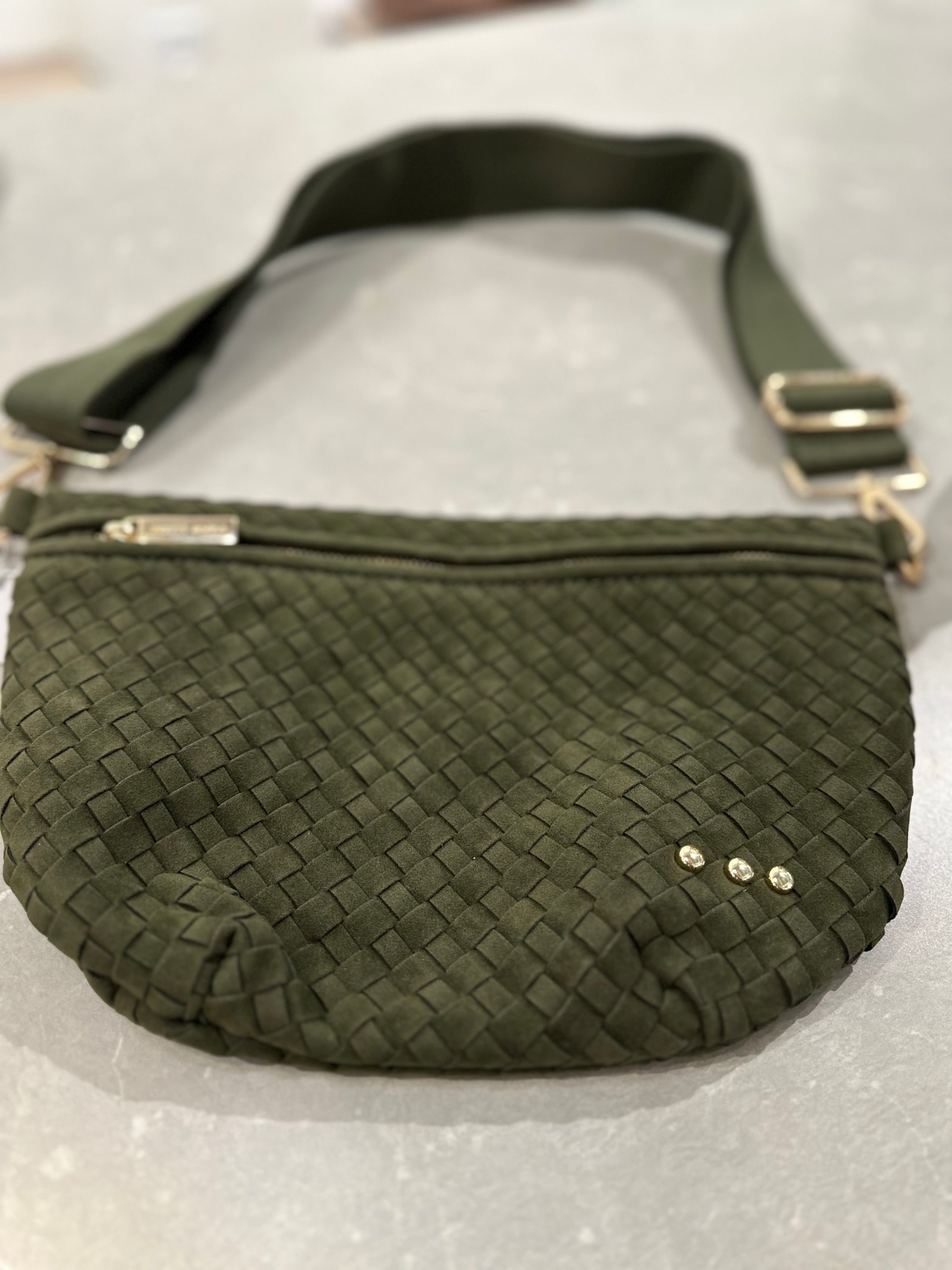 She's back and better than ever in a brand NEW FAUX SUEDE FINISH!!! A timeless classic - the Woven Westlyn Bum Bag! This design is such a classy take on a crossbody. Including the fun block design the strap has, the bag also has a zipper closure with beige and black chevron interior, and a zippered stash pocket on the inside. This crossbody bag is the perfect way to elevate any look all year long. So butter soft and a real show stopper. We love a functional yet unique bag!! Avail in 3 amazing bold fall colours - black, dark olive + dark navy. Strap is interchangeable.