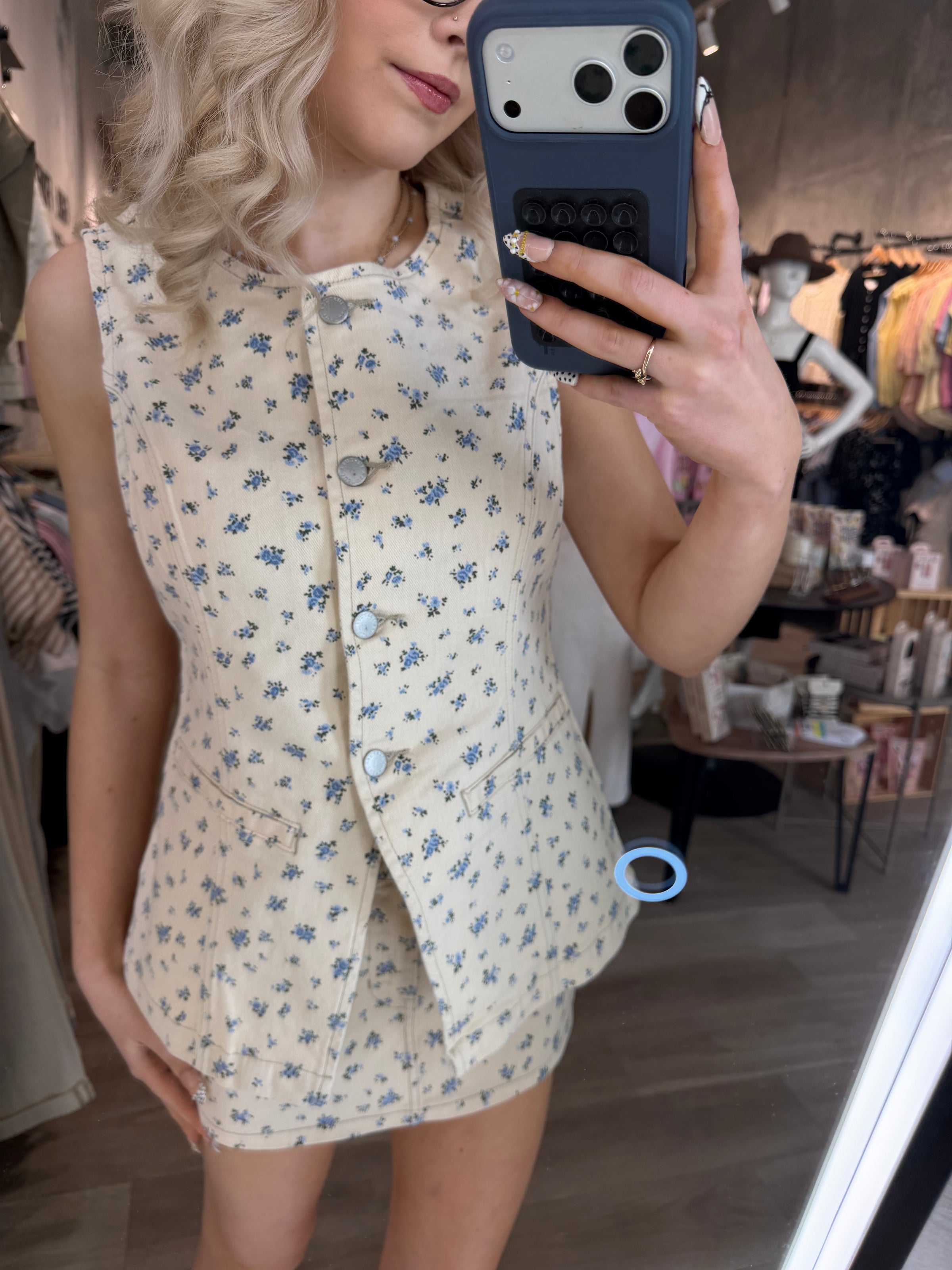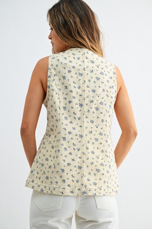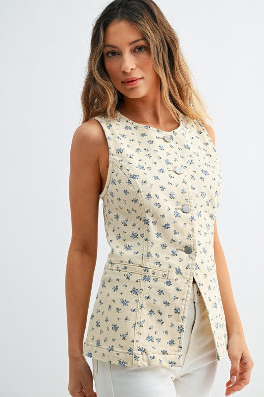 This blossom denim vest blends timeless style with modern versatility. Crafted from premium cream denim with blue floral print throughout, it features a sleeveless, tailored silhouette for a flattering layered look. Finished with a sleek button-front and metallic buttons, it adds a refined touch to any outfit.