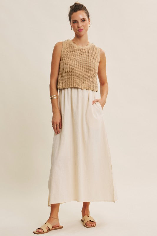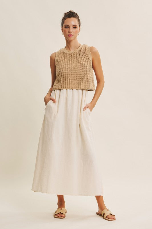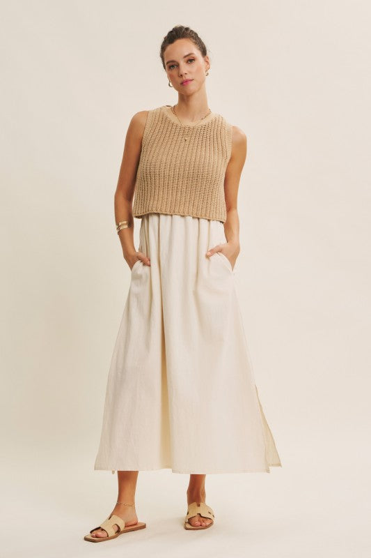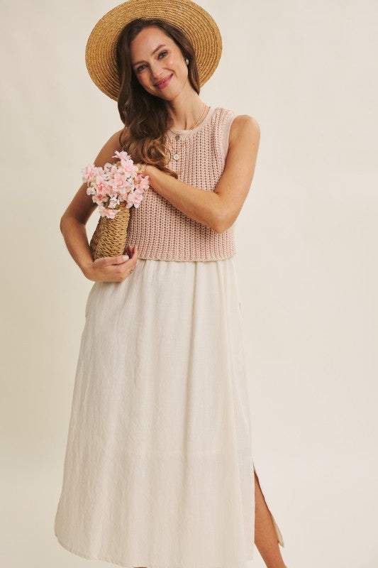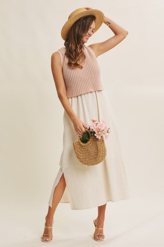 This stunning twofer midi dress with chunky sweater knit top and flowy cotton-blend skirt. Features back bow tie, elastic waist, side pockets, and side slits. Fully lined for comfort. Easy, versatile style for market mornings to weekend outings and all the spring and summer events. Two gorgeous colours - ice peach + creamy latte.