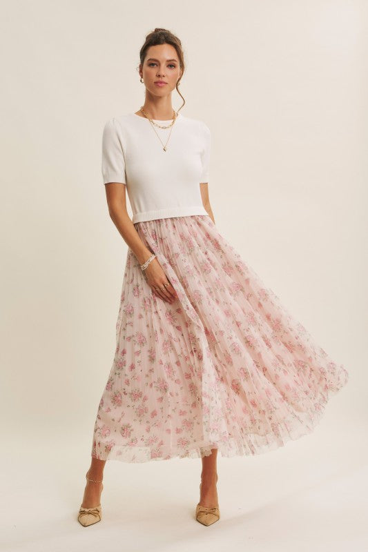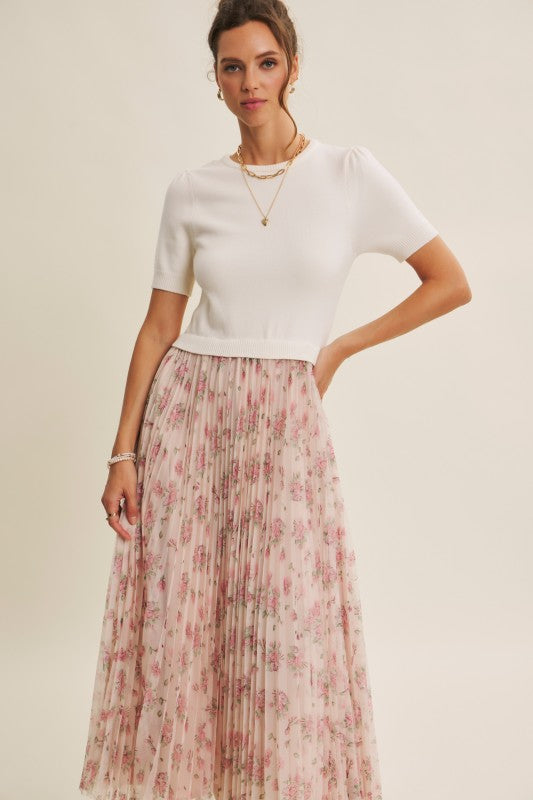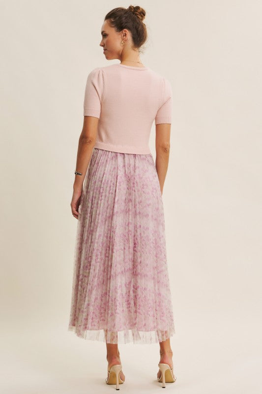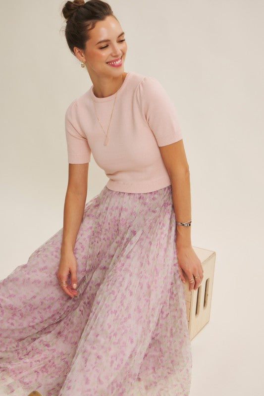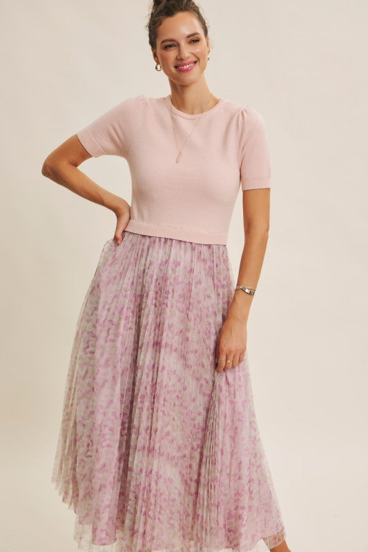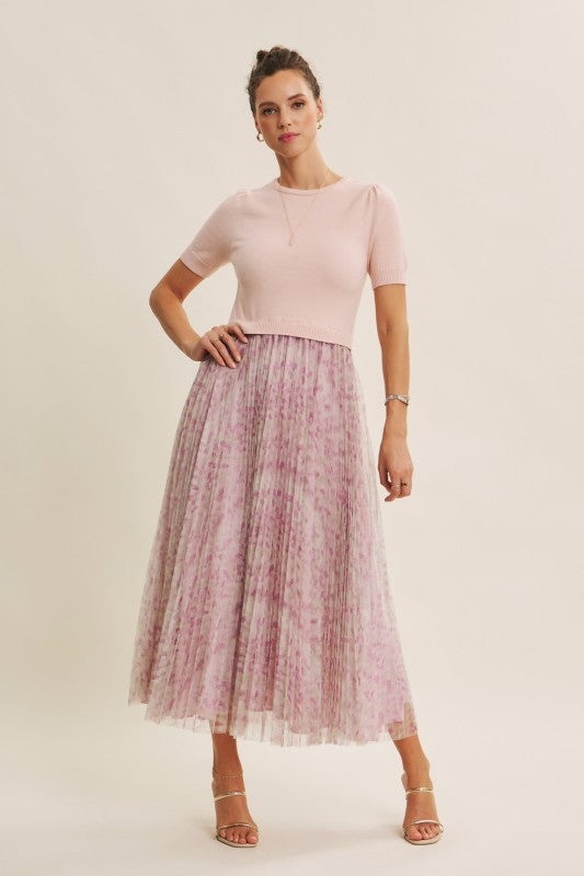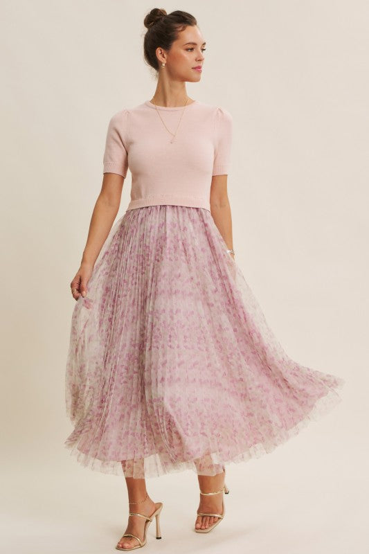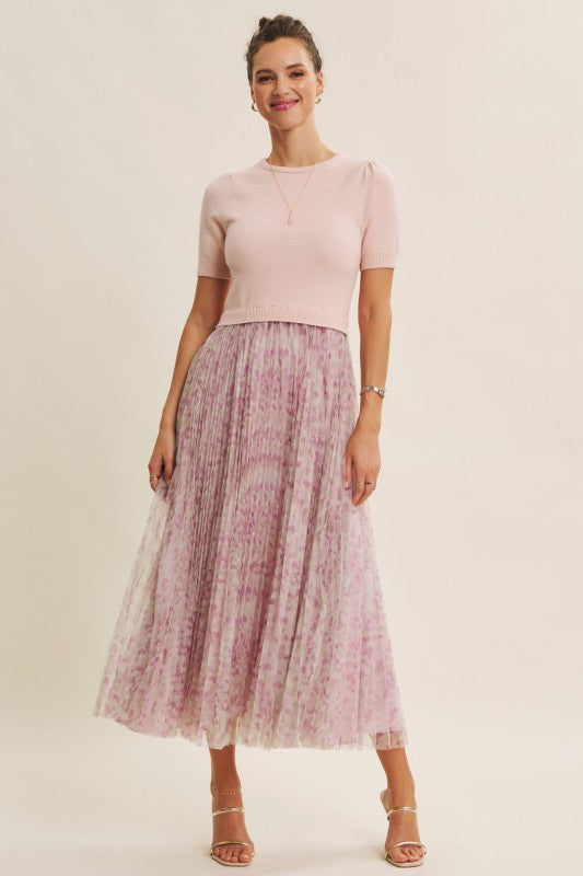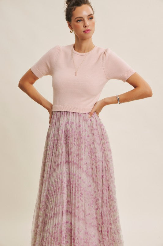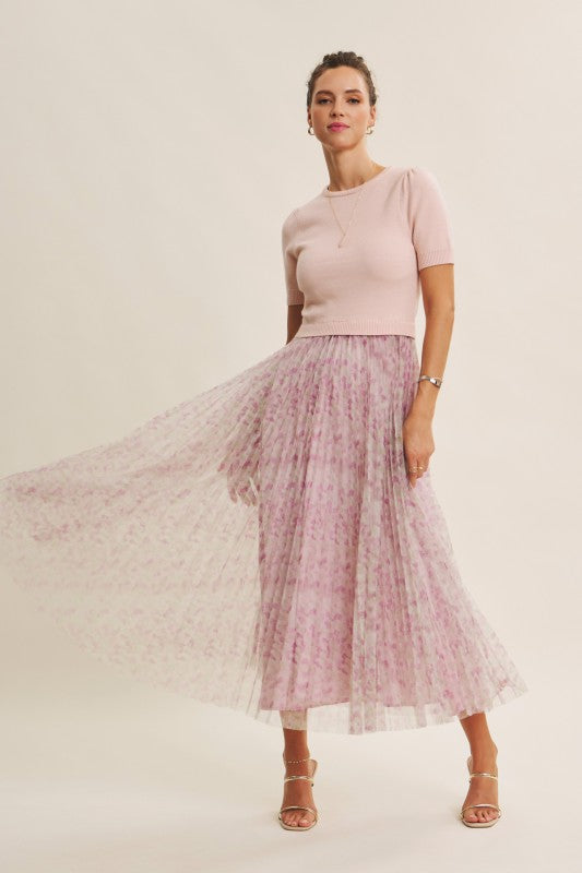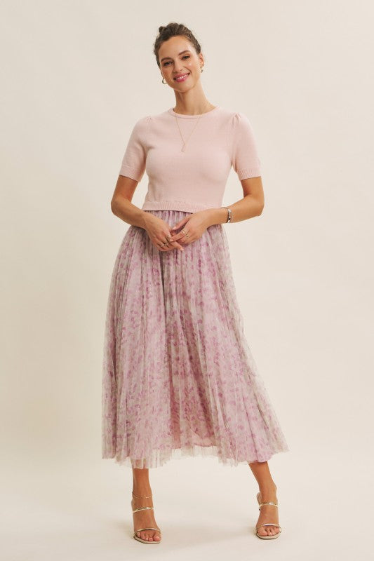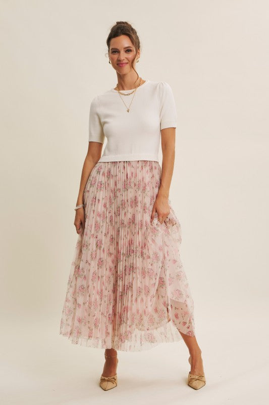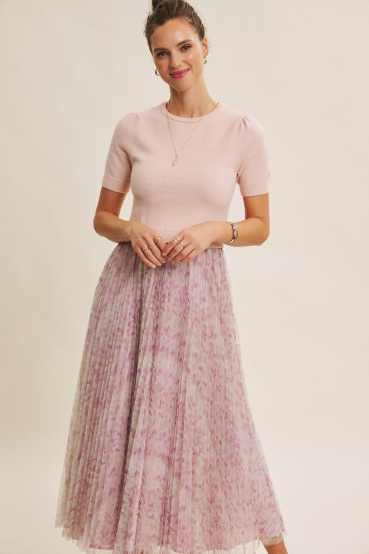 Meet the Wildflower Sweater Dress, the prettiest twofer you’ll reach for all season long. This romantic midi dress features a soft, lightweight knit sweater top with short sleeves, a classic round neckline, and the sweetest pin-tuck detailing at the shoulders. The airy knit flows effortlessly into a beautifully pleated floral mesh skirt that moves like a dream with every step.