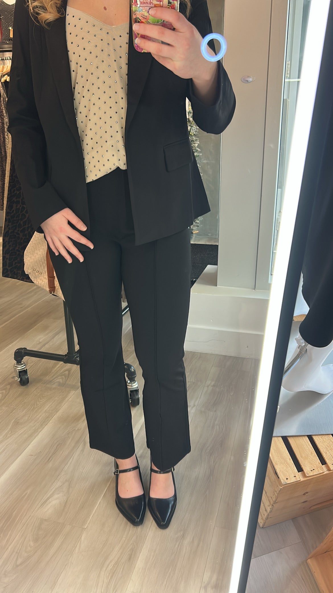 The Ultimate Stretch Ankle Flare Trousers - they earned their name from its amazing comfort level. So incredibly stretchy and such a classic for years to come. High waisted, hidden side zipper for easy off and on, elasticized waist, front seam detail and back seam detail, with a slight ankle crop fit and subtle ankle kick flare. Back trouser pockets (lined). Casual to Dressy. Super soft, great stretch, straight cut leg with baby flare, ankle length. Great on their own or pair them with the ultimate stretch blazer for a refined, classy look.