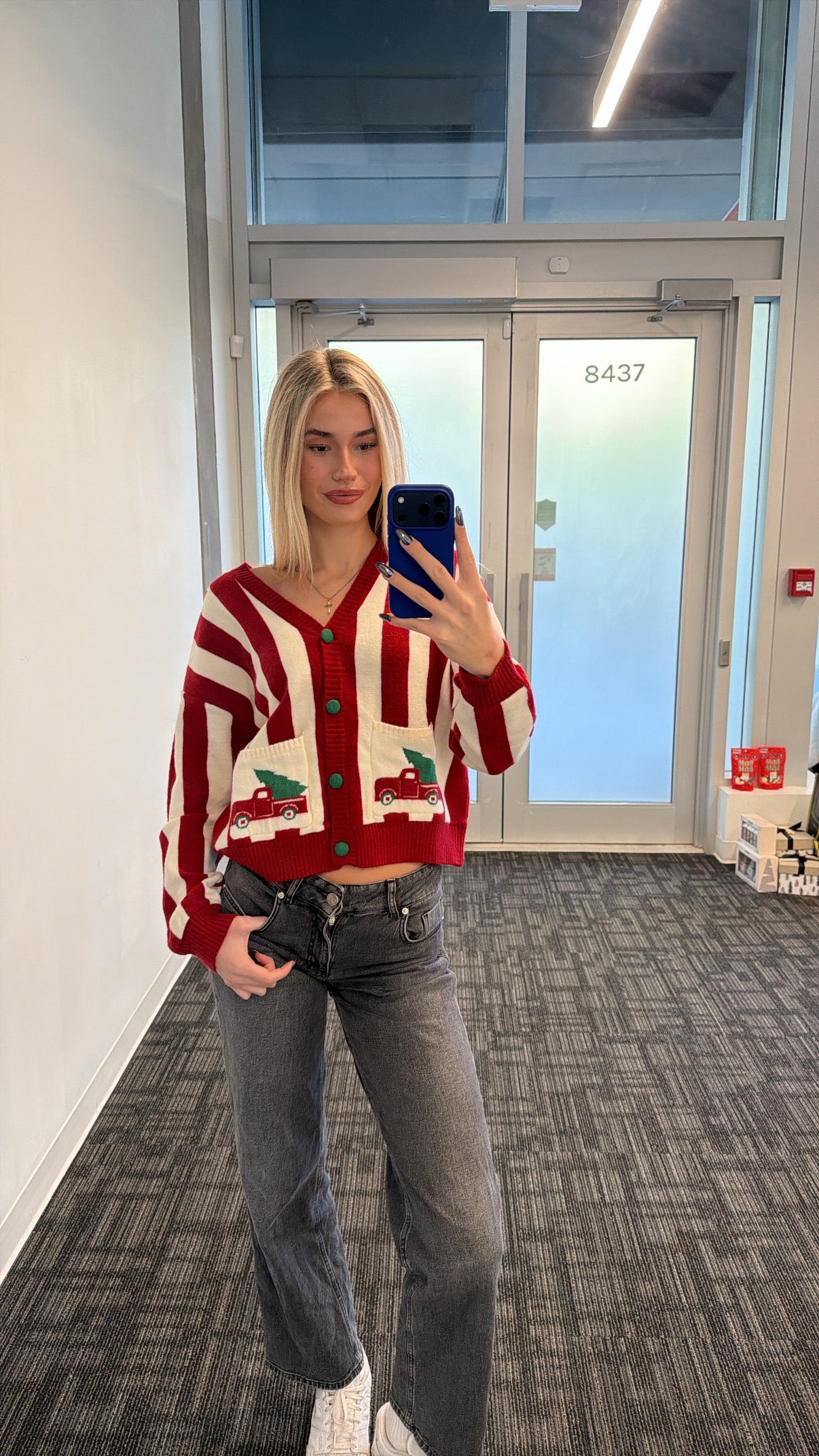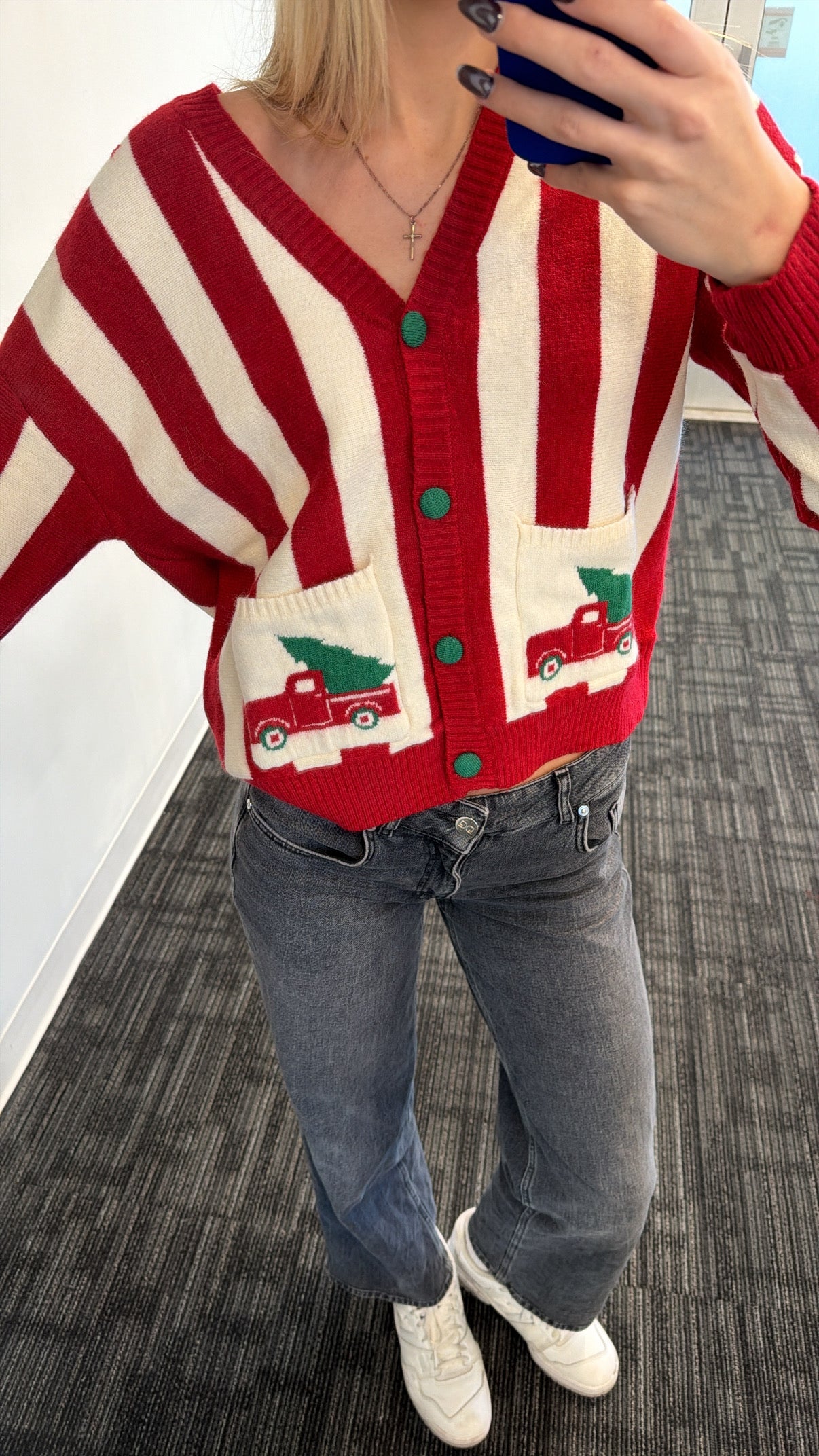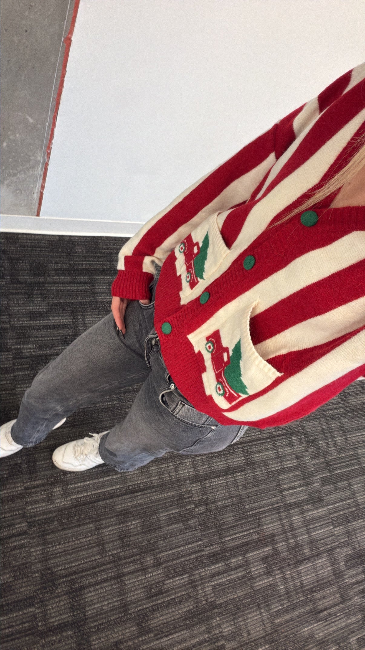 All the nostalgic holiday feels, rolled into one cozy and adorable cardigan! The Hallmark Cardi features a functional button-down front, V-neckline, and long sleeves, crafted in a super-soft, cozy knit. Available in festive red stripes, it’s complete with cute front patch pockets showcasing a vintage truck carrying a Christmas tree—pure holiday magic. Perfect for adding charm to your festive wardrobe, this cardigan is ideal for holiday gatherings, seasonal events, or simply spreading cheer.