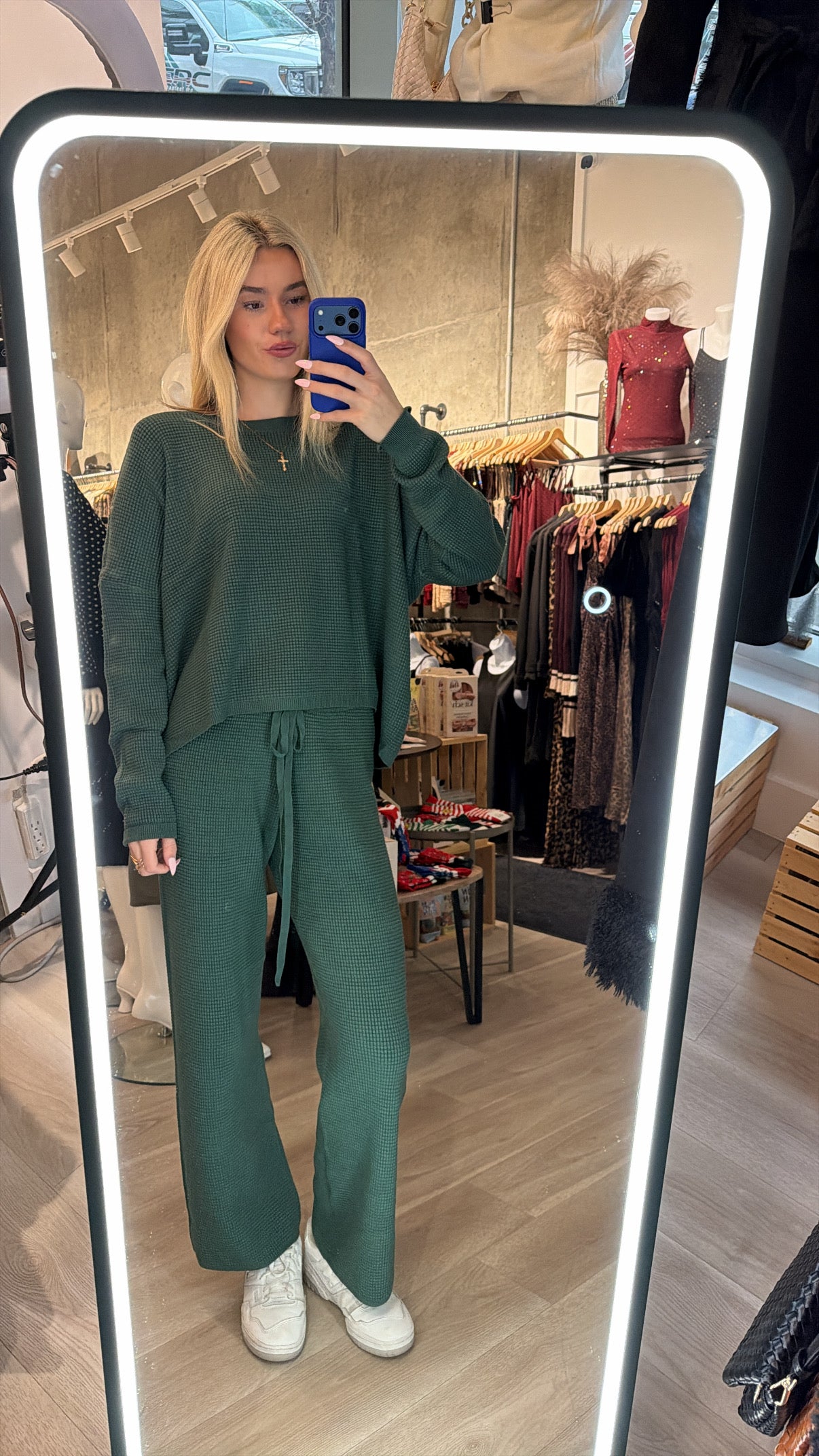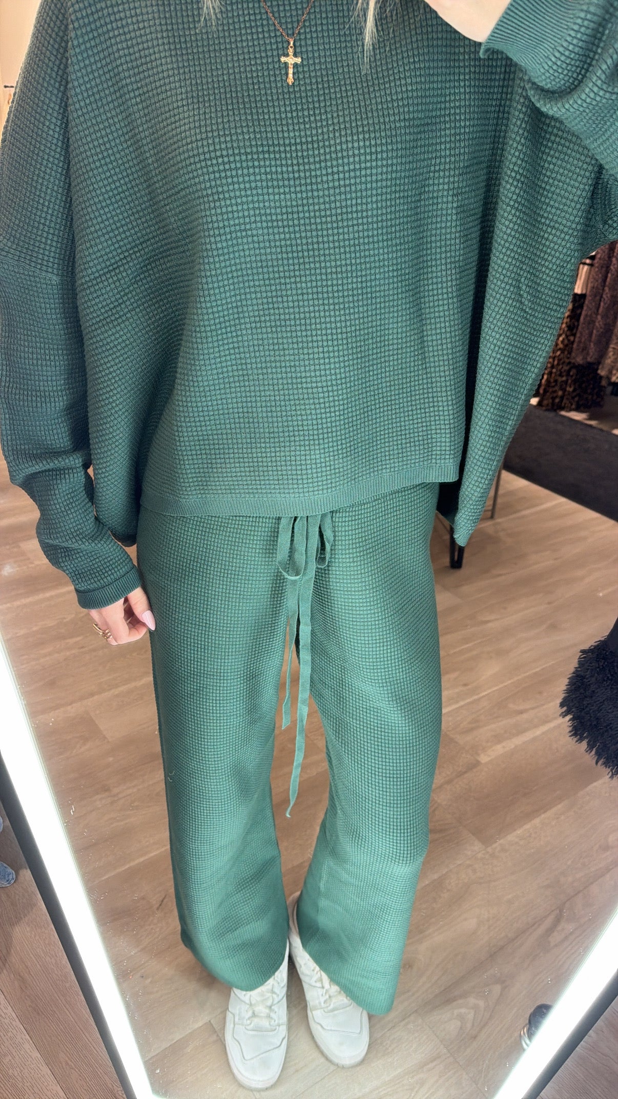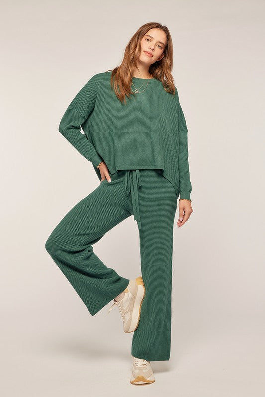 The comfiest pants you’ll ever own, with a chic twist. Designed in the same ultra-soft waffle knit you love, these pull-on pants feature an elasticized waist with an adjustable drawstring for the perfect fit. The slightly wide leg cut gives them an easy, flattering drape that works just as well with sneakers and a tee as it does dressed up with boots and a blazer. Pair them with the Knit Waffle High Low Sweater for the full set, or mix and match with any of the waffle tops for endless styling options. Available in four beautiful neutrals—black, cocoa, stone, and warm grey—in sizes S–XL. AND BRAND NEW IN TREKKING GREEN!