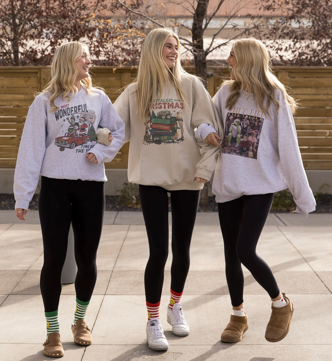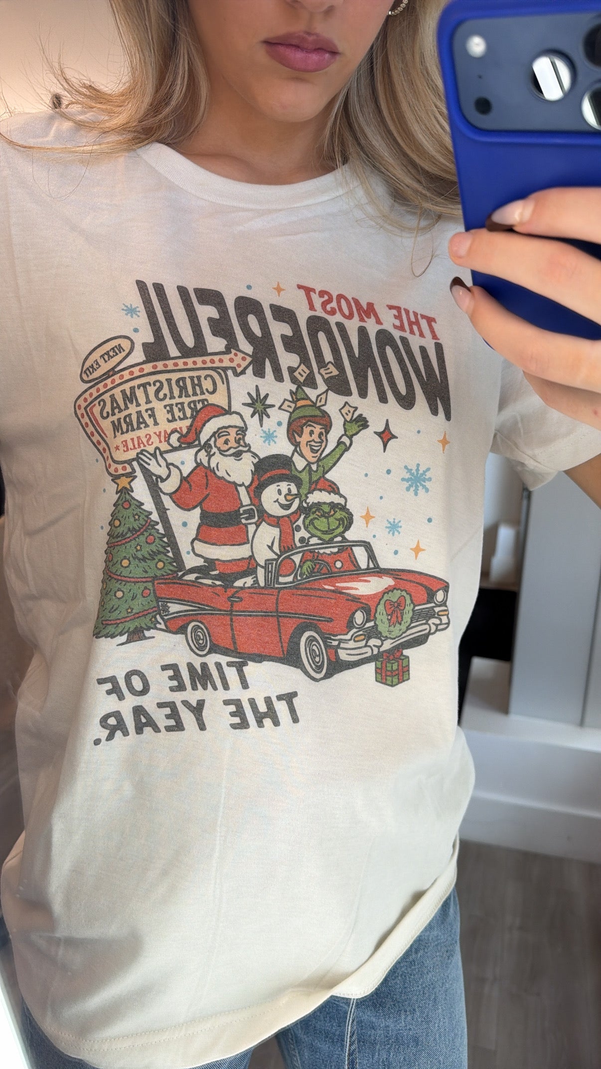 All the nostalgia, now in a cozy crew. This festive graphic reads The Most Wonderful Time of the Year and features a vintage car packed with a retro Santa, Elf, the Grinch, and Frosty the Snowman, all heading off to the Christmas tree farm. Printed on an ash heather grey crewneck, this unisex style is soft, classic, and perfect for layering all season long. Available in sizes S–XL, it’s holiday comfort you’ll reach for again and again.