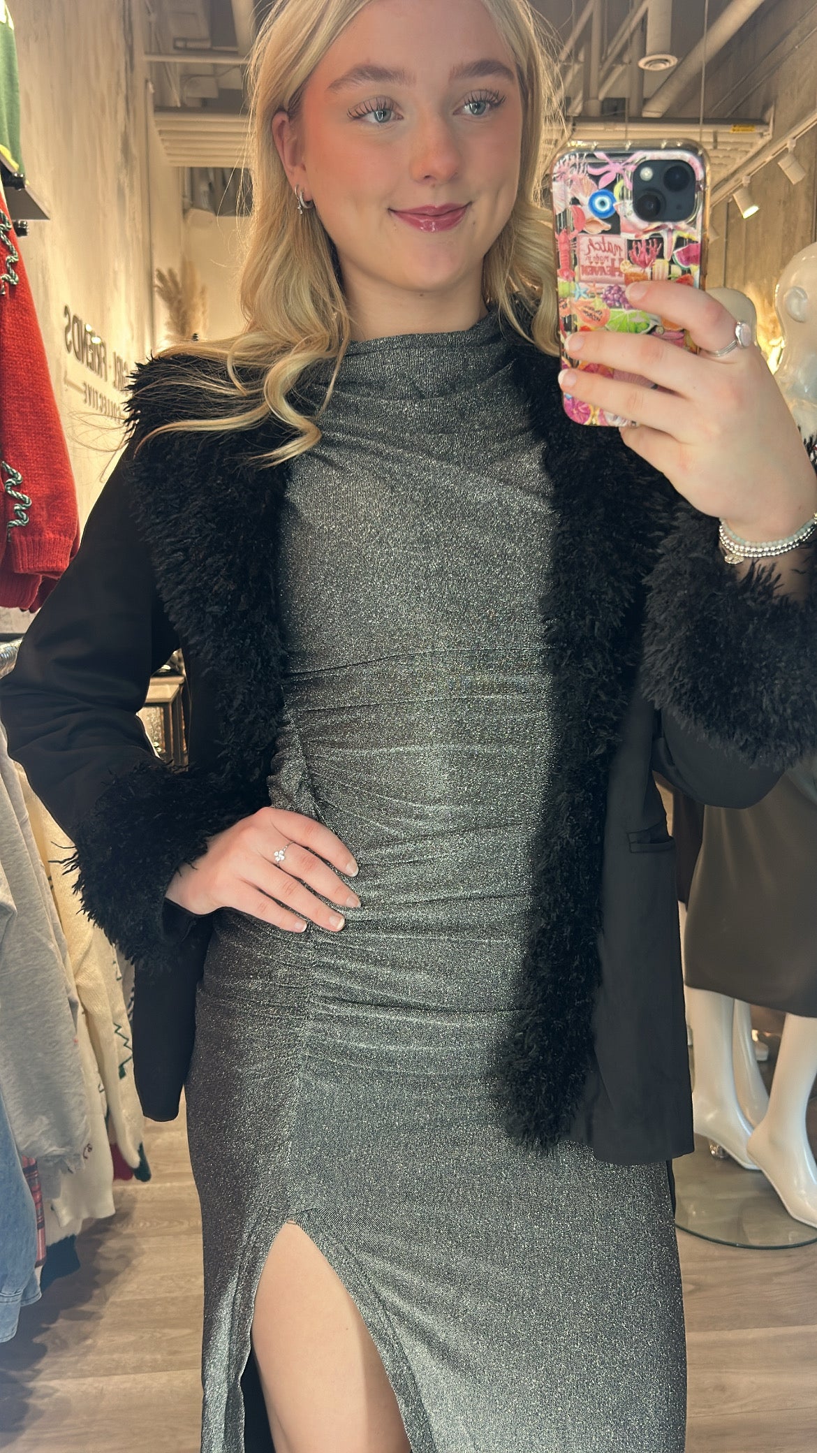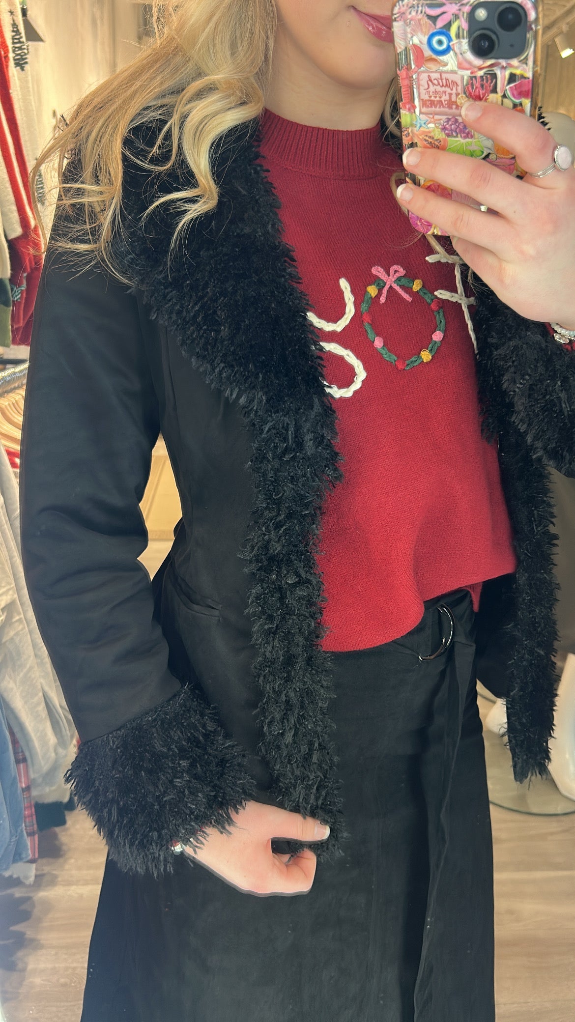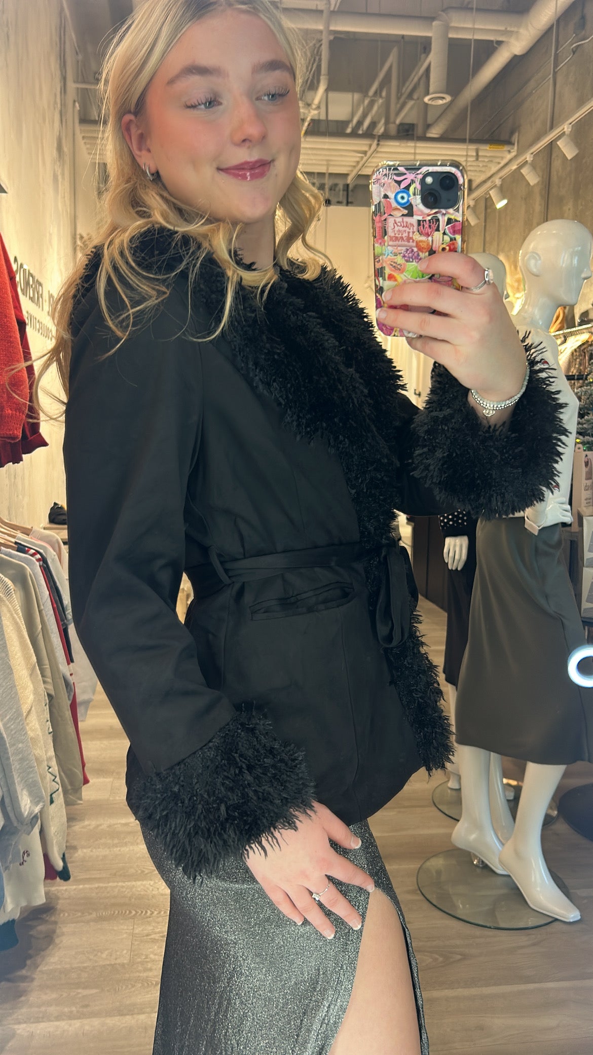 The Vivienne Black Suede Jacket brings all the nostalgic feels with its timeless, feminine charm. Crafted from an ultra-soft vegan suede that feels remarkably close to the real thing, this piece is designed to elevate any winter wardrobe. It features an oversized faux fur collar extending down the length of the open front design and fur cuffs, creating a stunning retro-inspired silhouette that is both elegant and warm. The jacket comes with a removable belt, open concept so the belt keeps it closed if that's your jam.
