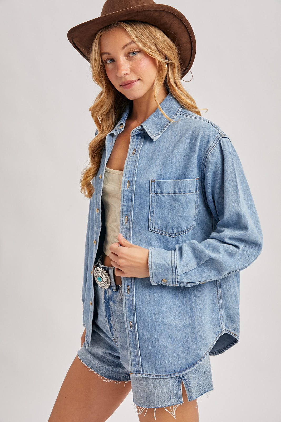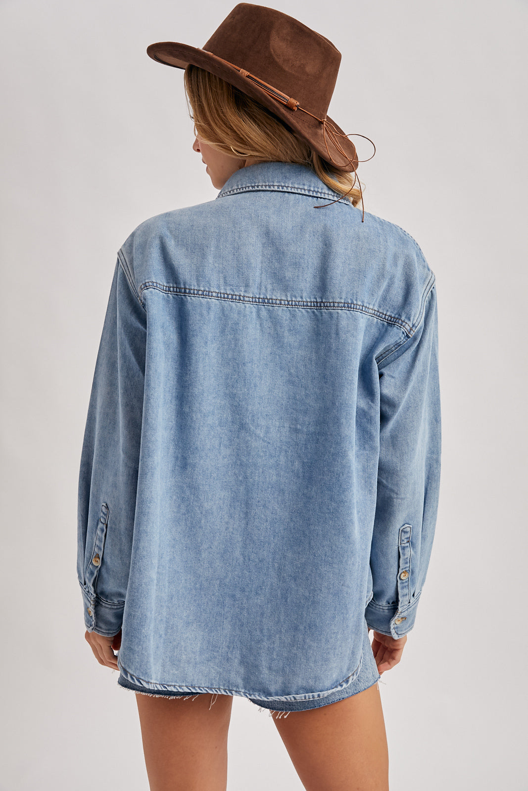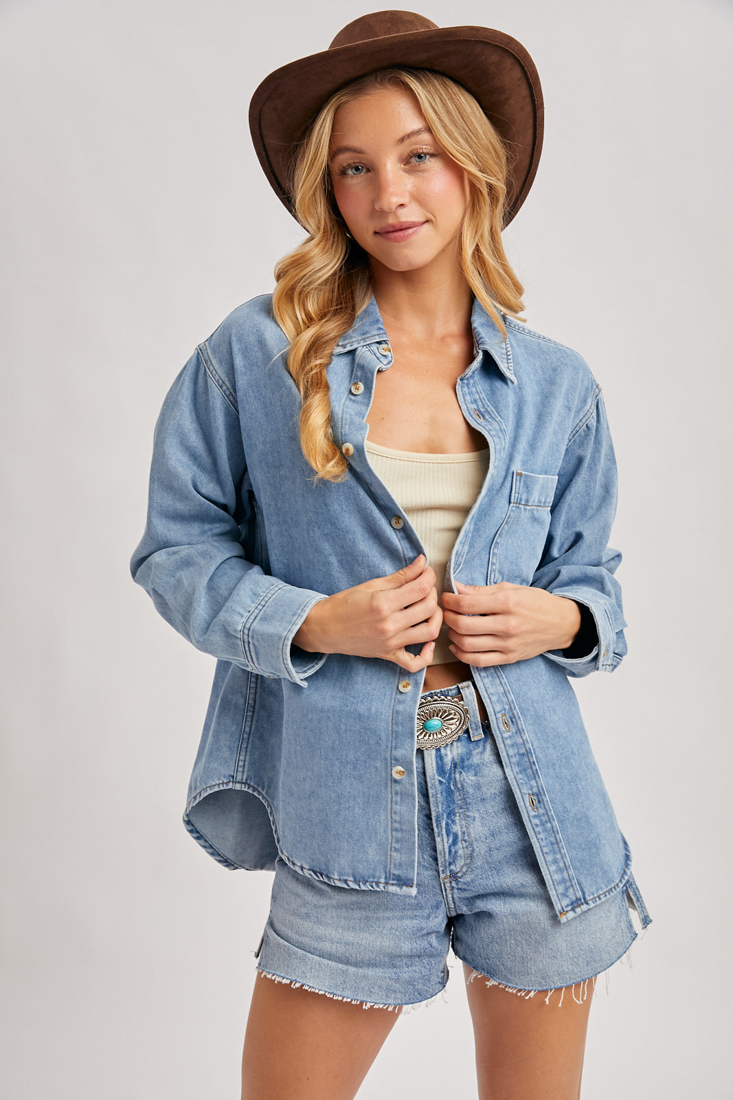 A modern take on a timeless classic, this oversized denim shirt is an indispensable wardrobe staple. Crafted from a versatile light and medium-wash blue denim, it offers a relaxed, slouchy silhouette for an effortlessly cool and comfortable fit. It features all the traditional details, including a pointed collar, a full button-down placket, a single chest pocket, and buttoned cuffs. Perfect for layering over a turtleneck or wearing on its own, its "shacket" style provides endless versatility for year-round wear.