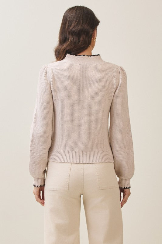 Sweet with a touch of sophistication, the Whip Stitch Bow Cardigan is the perfect piece to take you from workdays to holiday parties. Featuring a beautiful sand knit base with contrasting black whip stitch detailing and functional black buttons down the front, it’s as versatile as it is charming.