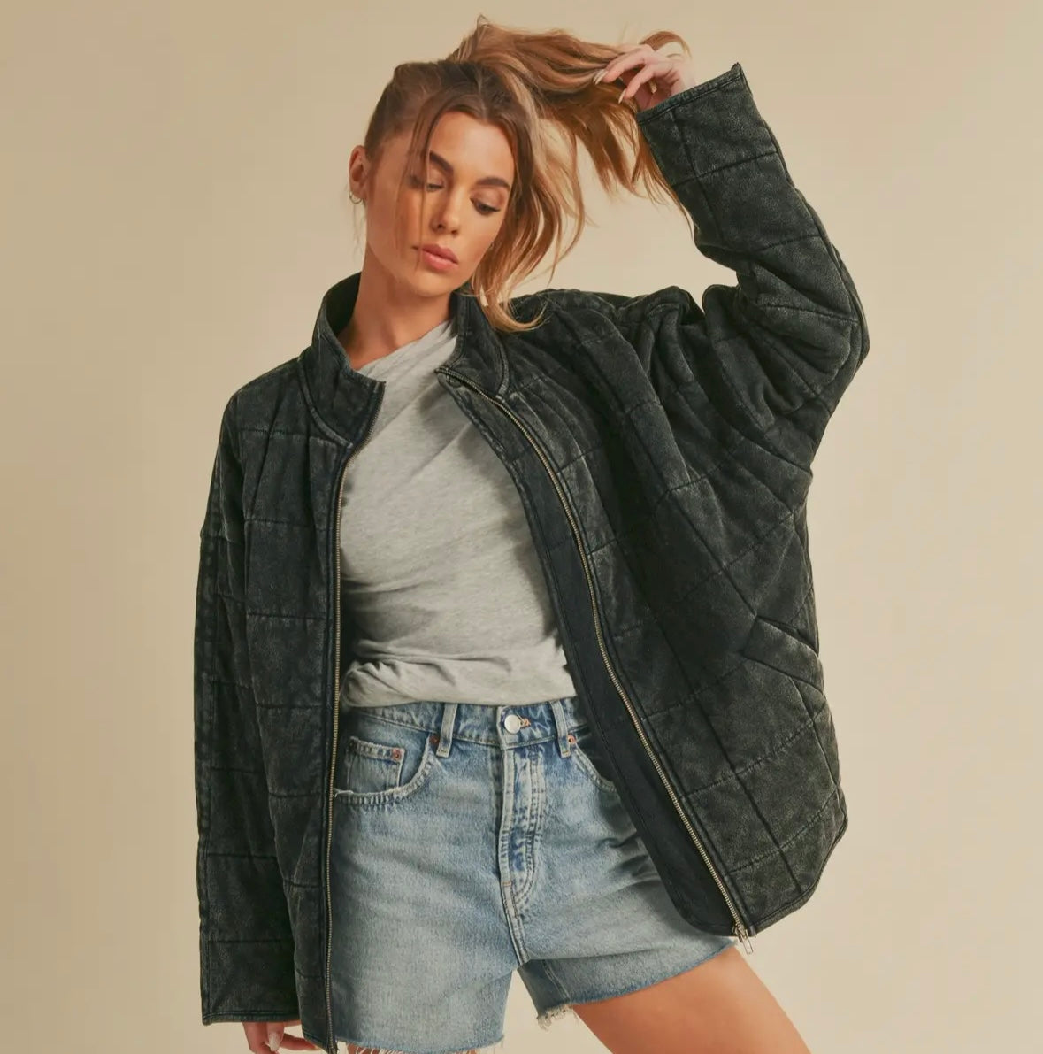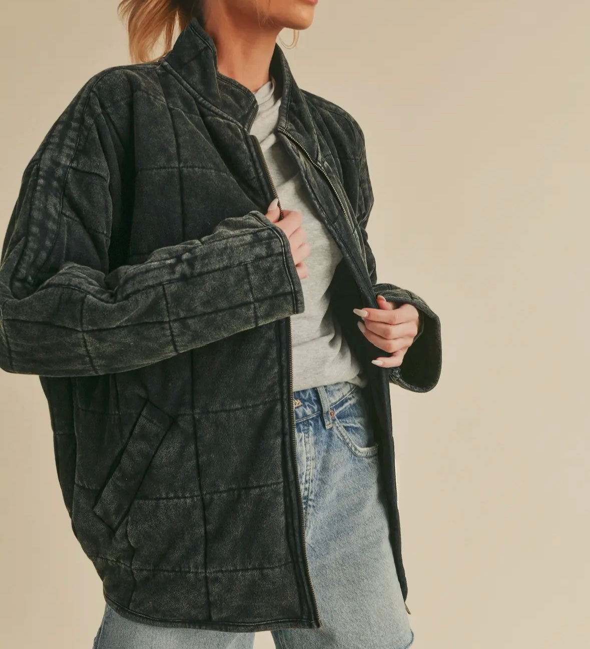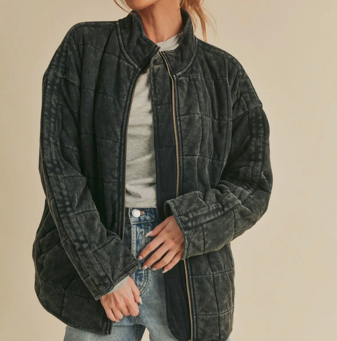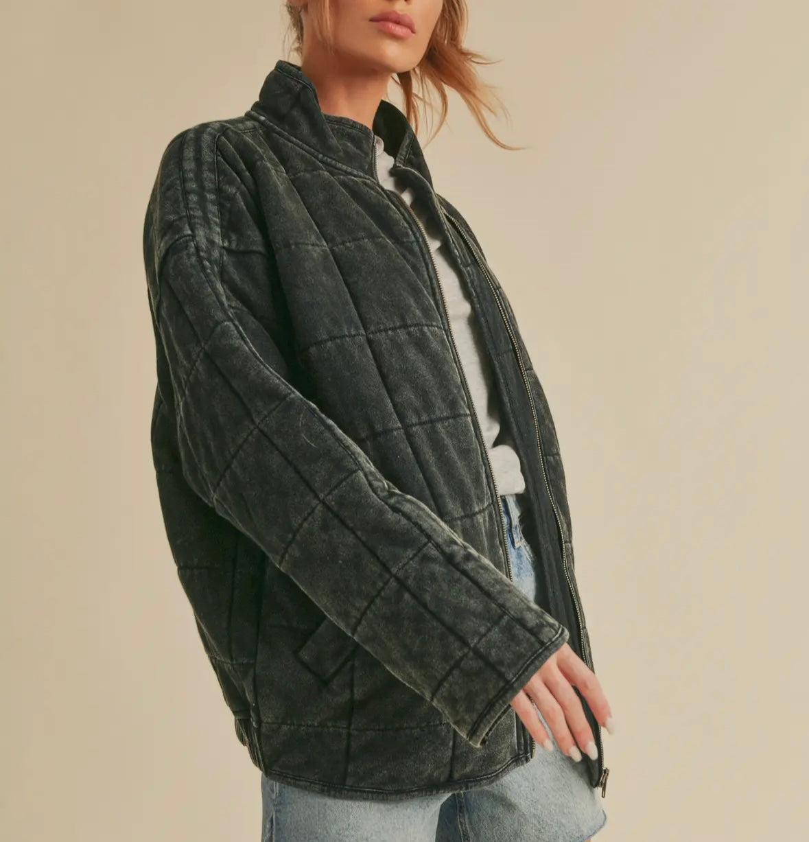 Introducing the perfect quilted washed oversized Dixie jacket. Features a thoughtfully crafted design that strikes the ideal balance between fashion-forward and comfort. The oversized silhouette exudes a relaxed and laid-back vibe while the dolman sleeves add a touch of sophistication and uniqueness. The material is made from high-quality 100% cotton fabric that is pleasant to the touch and surely to to turn heads wherever you go. Very similar fit + feel as our famous RyLey Bomber. Avail in chocolate brown, mineral wash latte + mineral wash black.