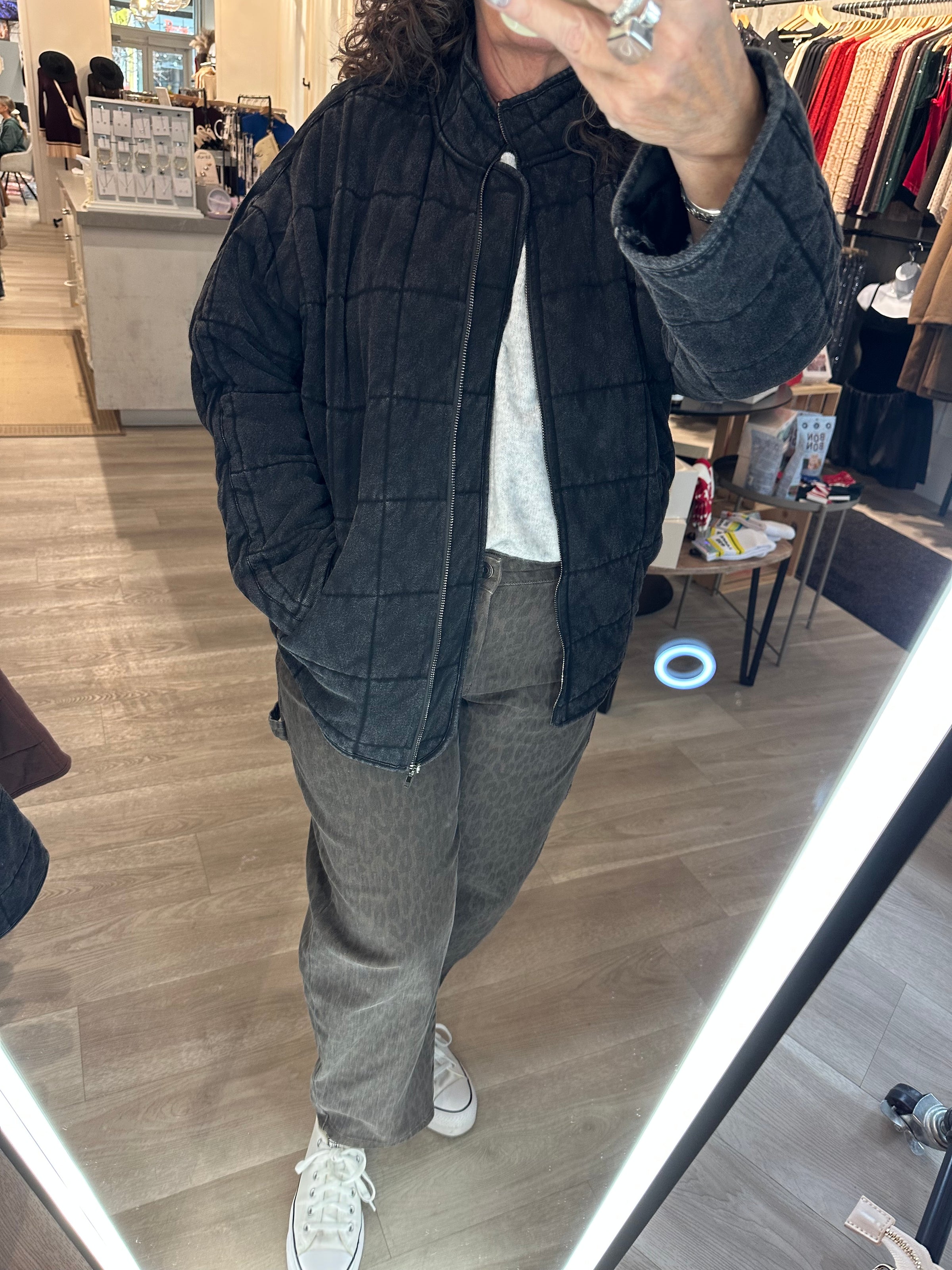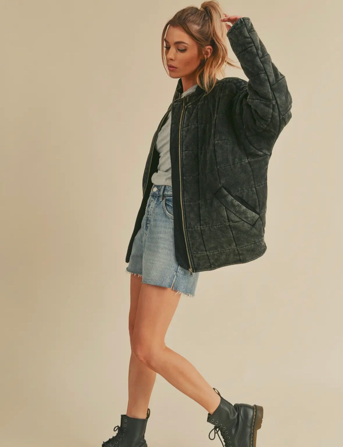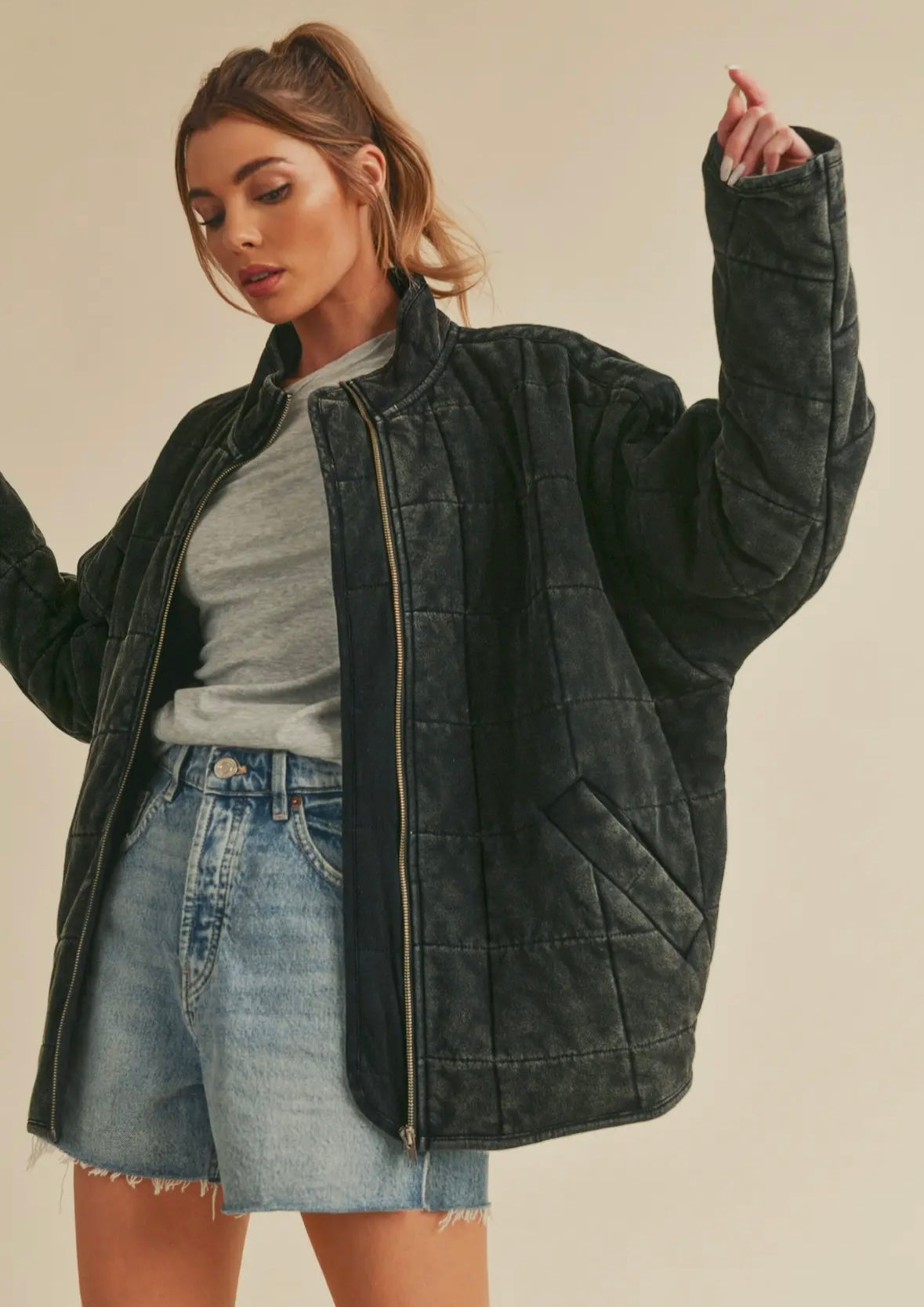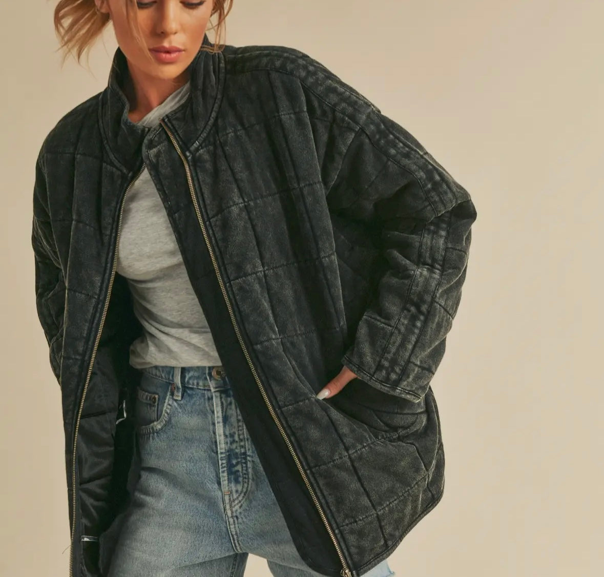 Introducing the perfect quilted washed oversized Dixie jacket. Features a thoughtfully crafted design that strikes the ideal balance between fashion-forward and comfort. The oversized silhouette exudes a relaxed and laid-back vibe while the dolman sleeves add a touch of sophistication and uniqueness. The material is made from high-quality 100% cotton fabric that is pleasant to the touch and surely to to turn heads wherever you go. Very similar fit + feel as our famous RyLey Bomber. Avail in chocolate brown, mineral wash latte + mineral wash black.