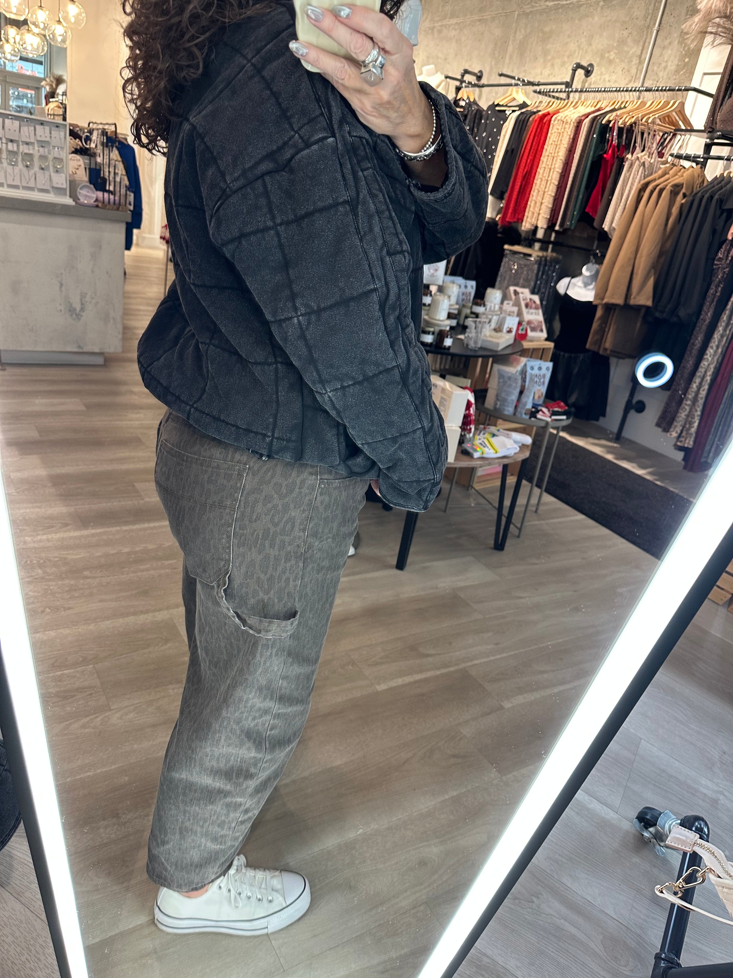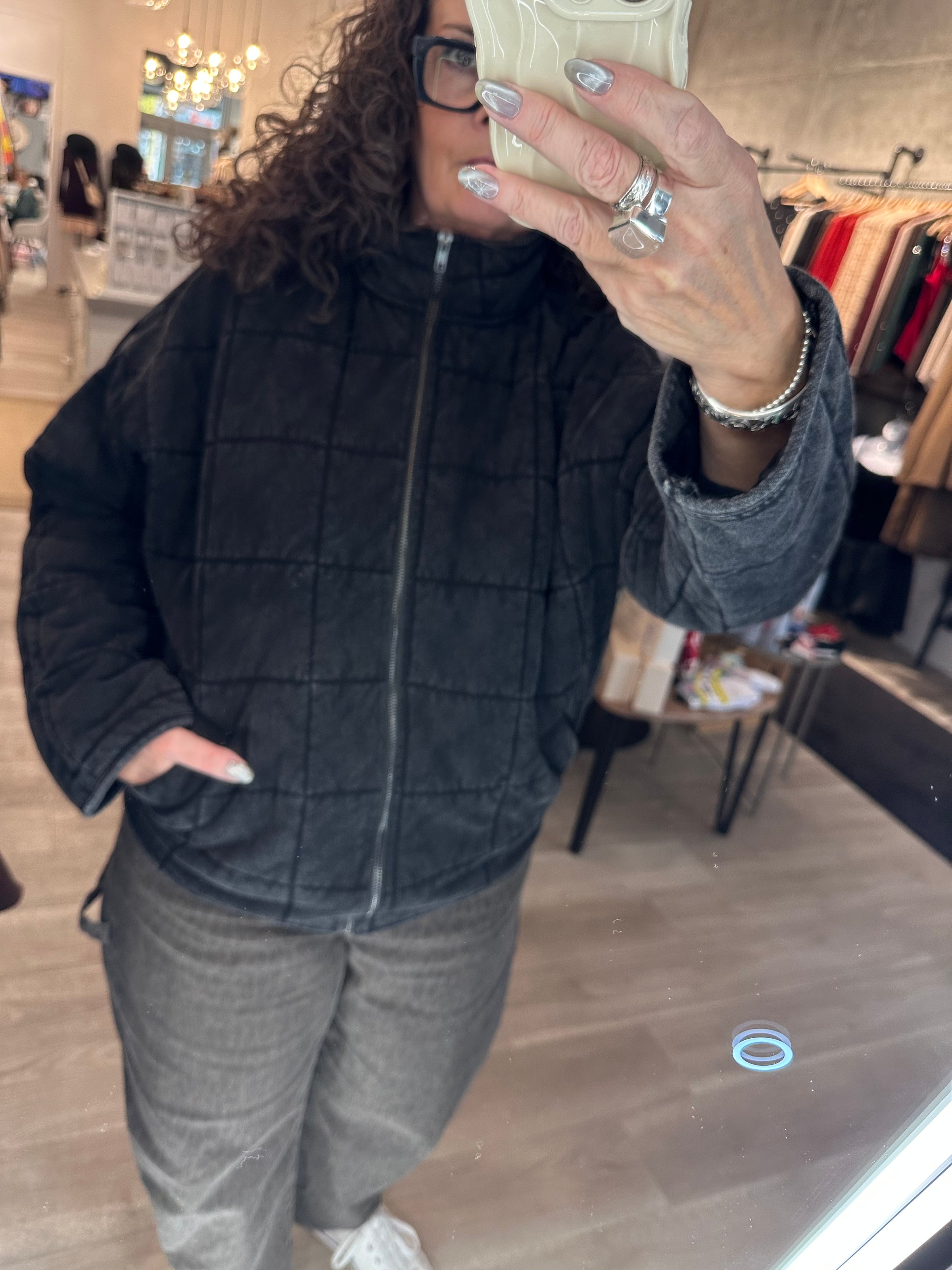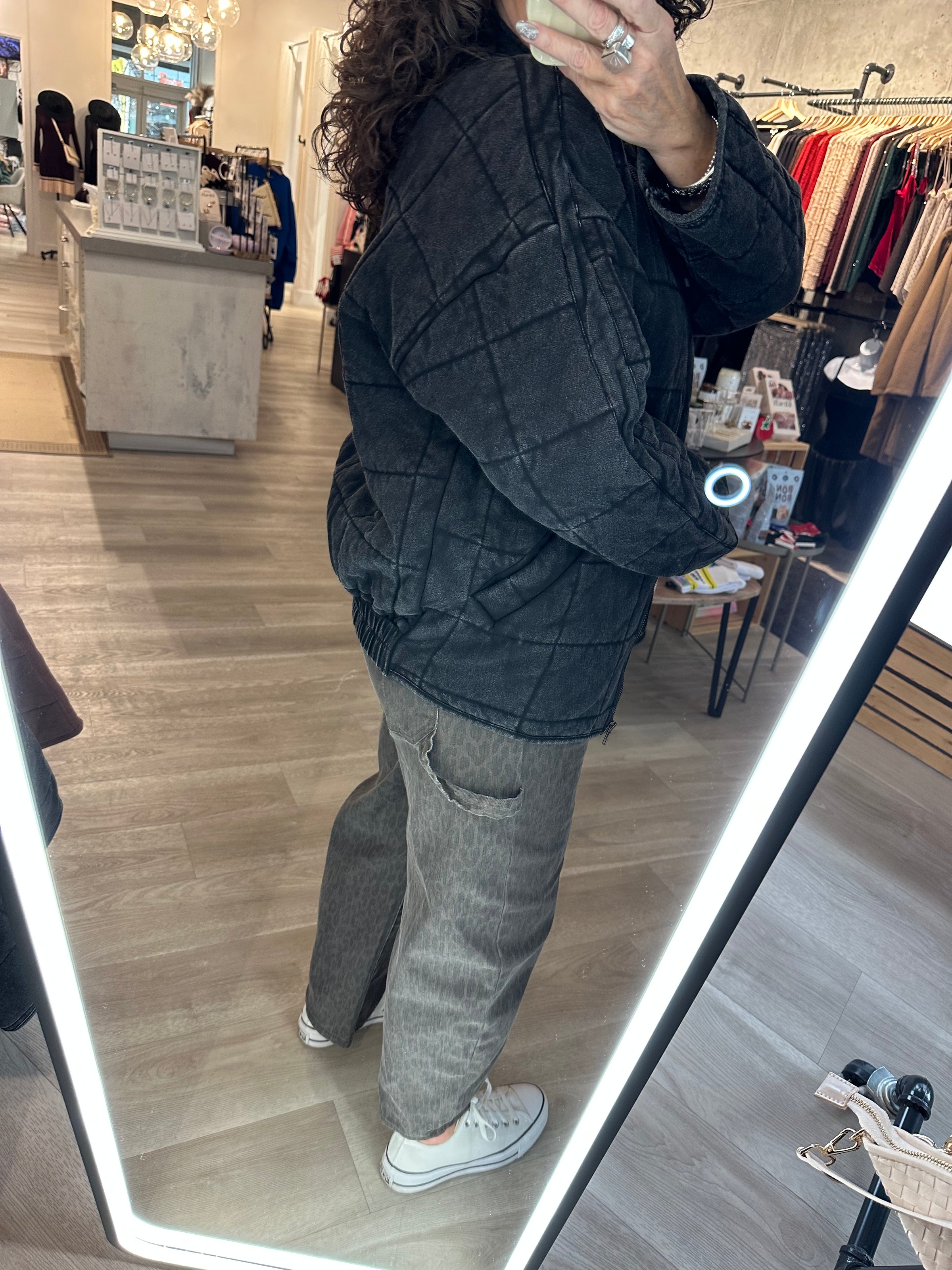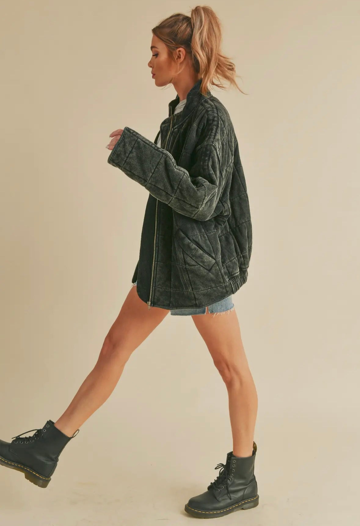 Introducing the perfect quilted washed oversized Dixie jacket. Features a thoughtfully crafted design that strikes the ideal balance between fashion-forward and comfort. The oversized silhouette exudes a relaxed and laid-back vibe while the dolman sleeves add a touch of sophistication and uniqueness. The material is made from high-quality 100% cotton fabric that is pleasant to the touch and surely to to turn heads wherever you go. Very similar fit + feel as our famous RyLey Bomber. Avail in chocolate brown, mineral wash latte + mineral wash black.