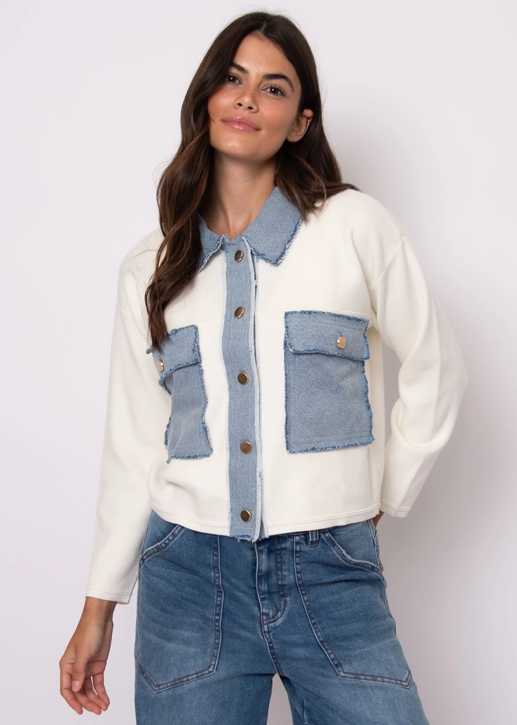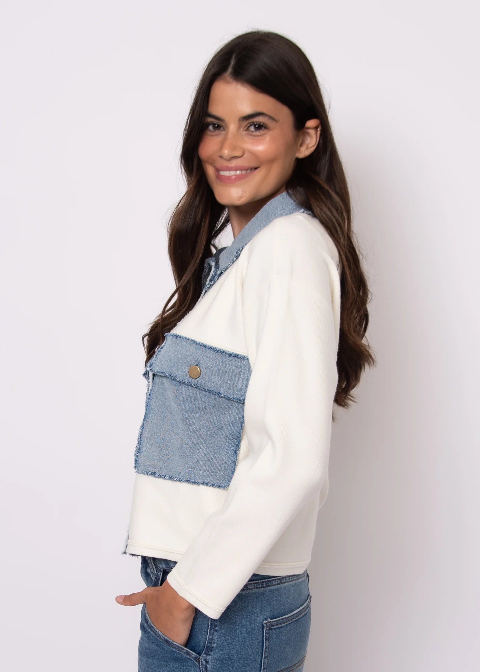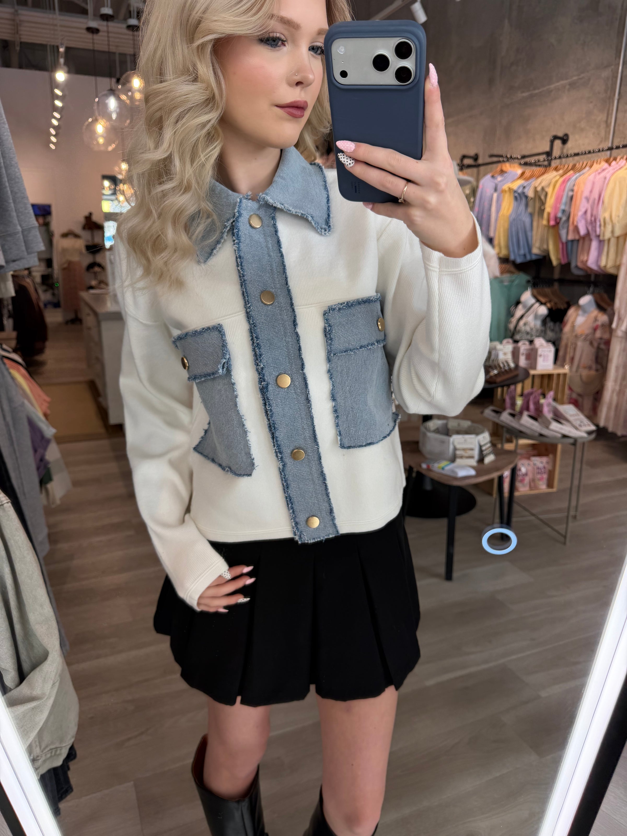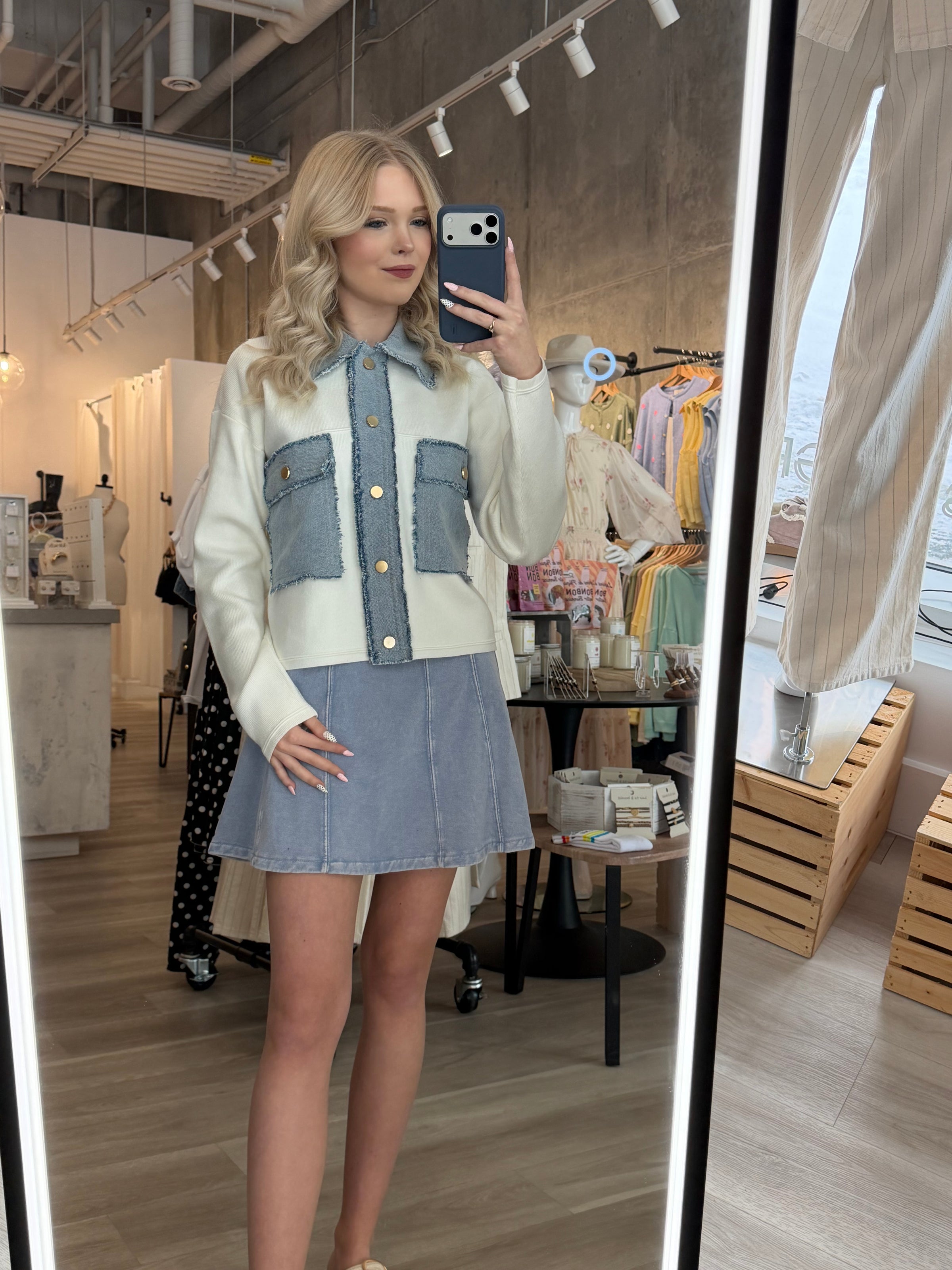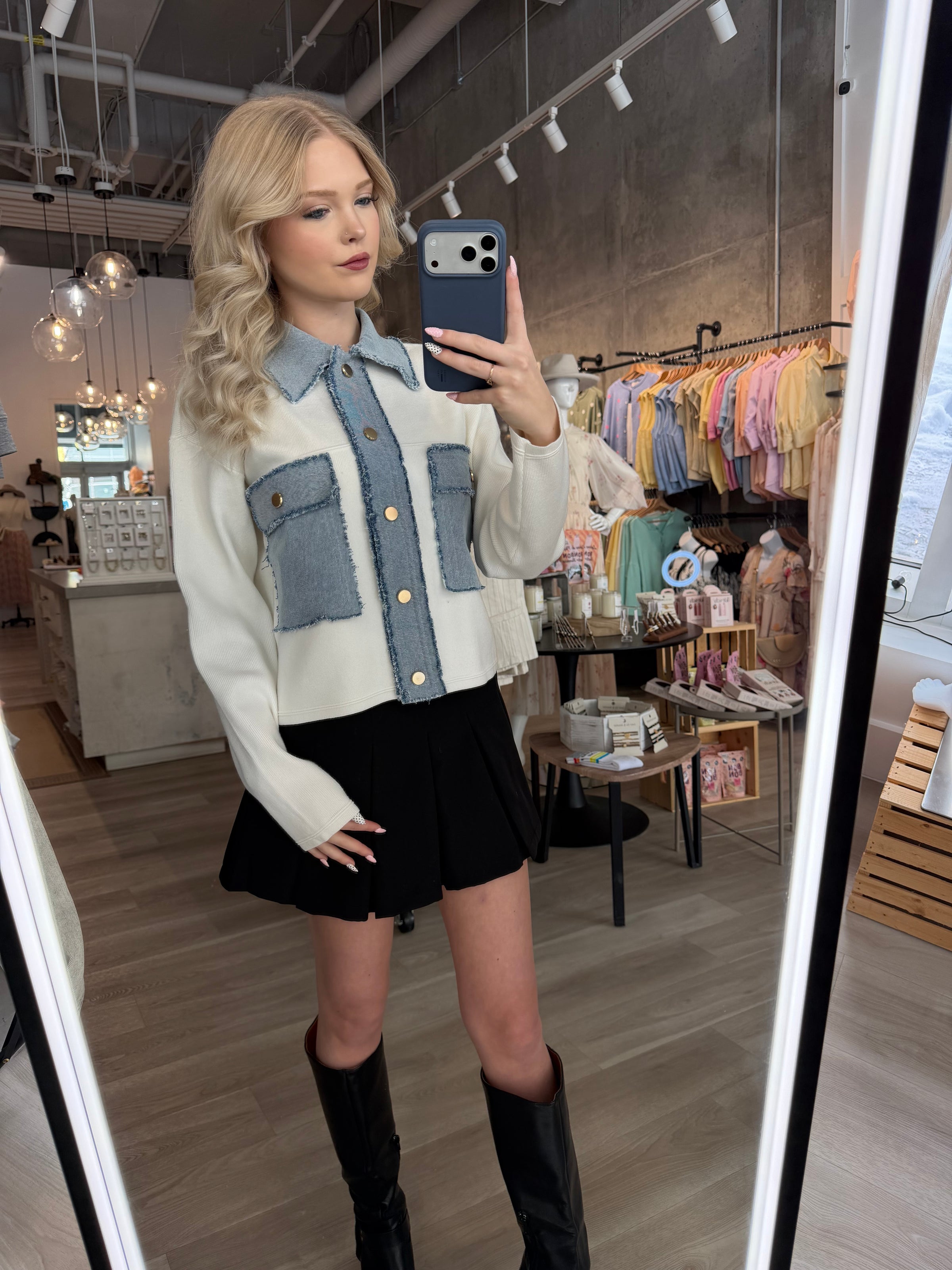 Meet the Avril Denim Combo Cardigan—your new go-to for effortless, everyday cool. Designed with an ultra-soft cozy knit and elevated with playful denim accents, this piece brings the perfect mix of comfort and edge to any outfit.