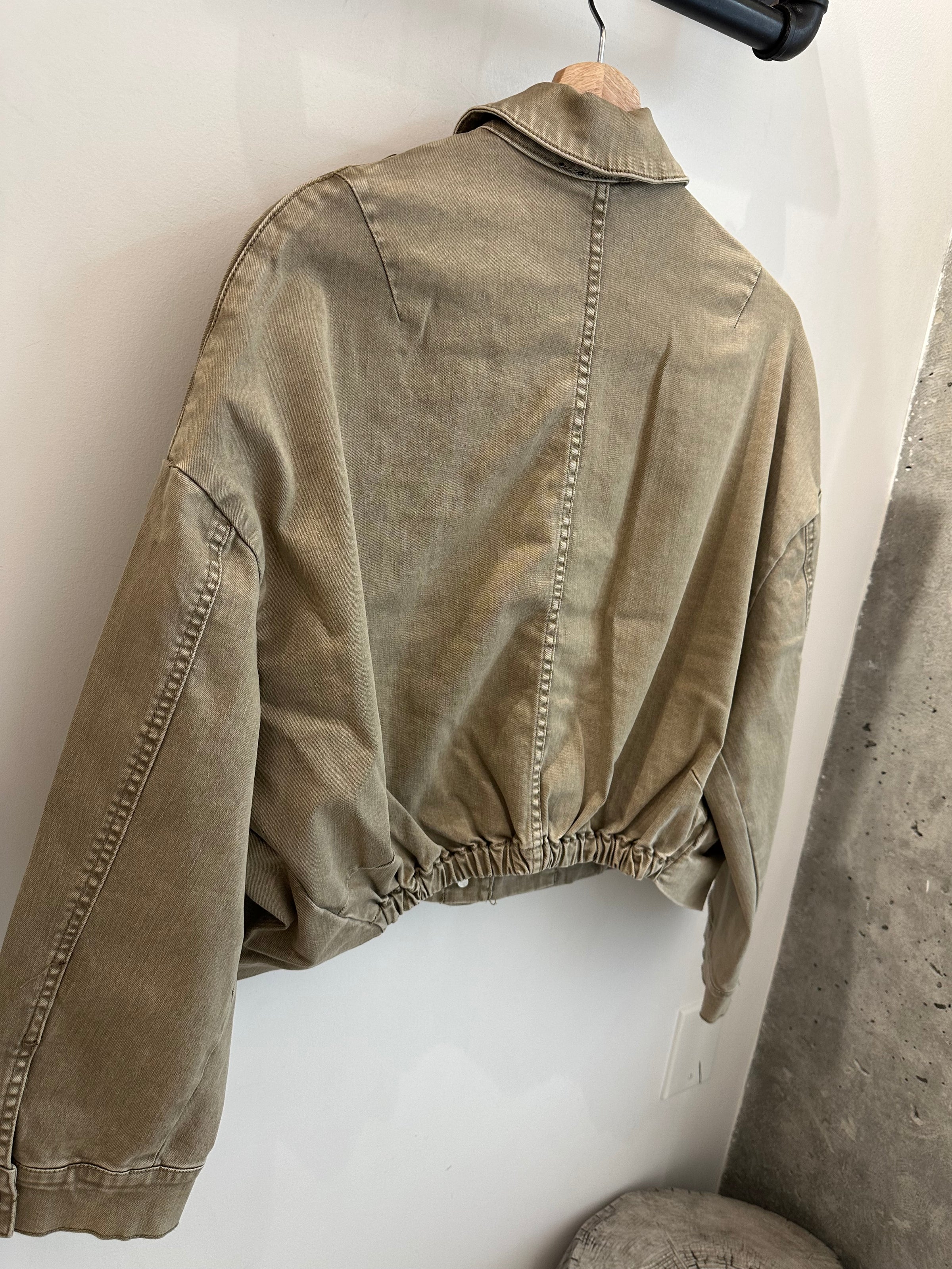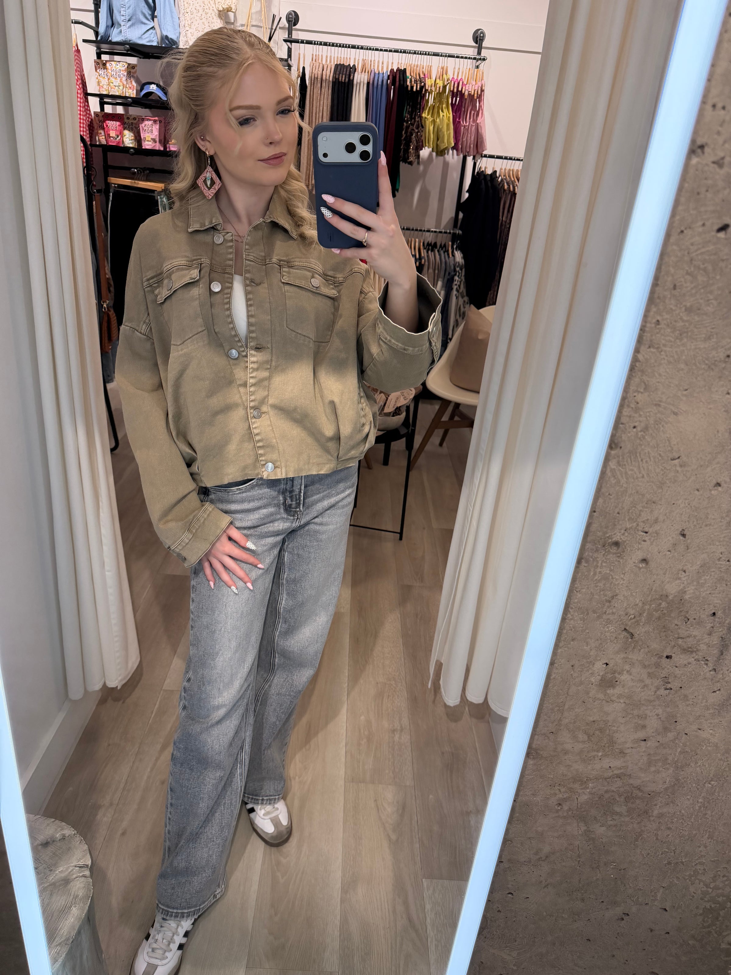 Crafted from a soft, stretchy twill cotton, this easy layer features a relaxed, roomy fit with a signature bubble hemline that adds just the right amount of shape and charm. Designed with a classic collar, long sleeves, a functional button-up front, and side pockets, it blends everyday comfort with elevated style.