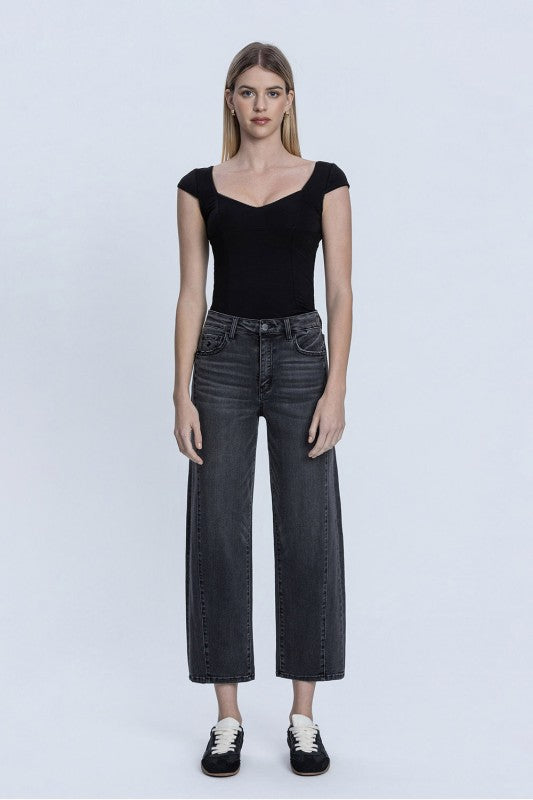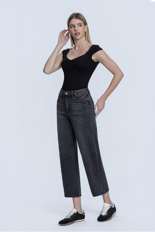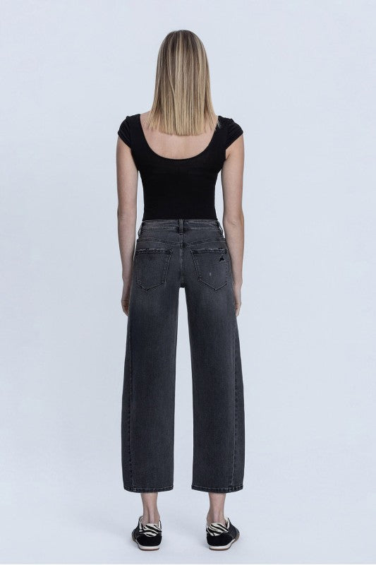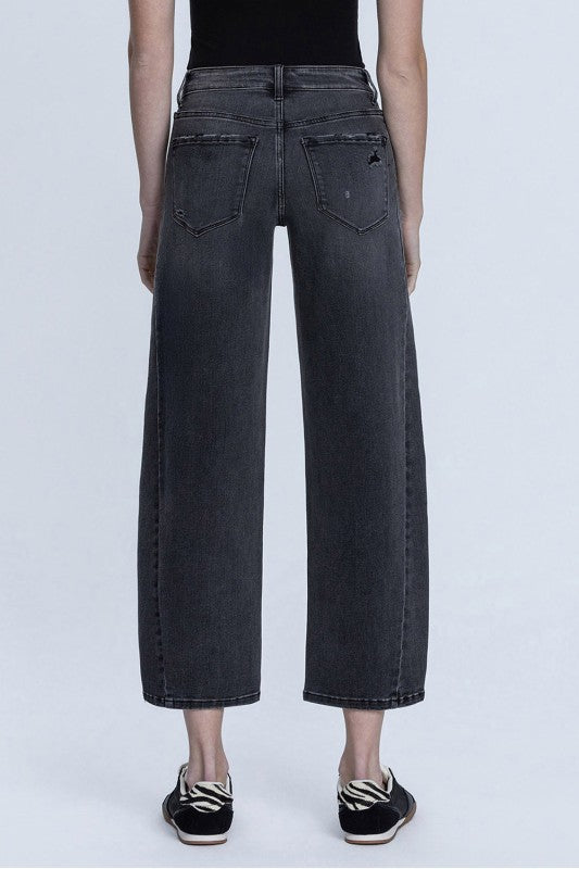 Meet your new go-to denim. These black crop baby barrel jeans feature a flattering high-rise (11” rise) and are crafted from ultra-soft comfort stretch denim for all-day wear. Designed in a gorgeous mineral-wash black with subtle whiskering, they feature classic five-pocket styling, light distressing, and unique side panel seam detailing for a modern edge. The cropped, softly structured baby barrel leg offers a relaxed shape without feeling overly wide, finished with a clean hem for a polished look.