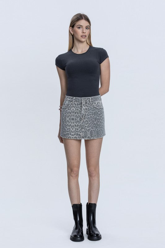 The Rebel Miniskirt is the perfect mix of edgy and effortless. Made from comfort stretch denim with 98.5% cotton and 1.5% spandex, this grey wash leopard print denim mini is soft, flattering, and easy to wear. It features a high rise waist, classic five pocket design, and subtle distressed details at the pockets and hem for a perfectly worn-in feel, finished with a clean hem for a polished touch.