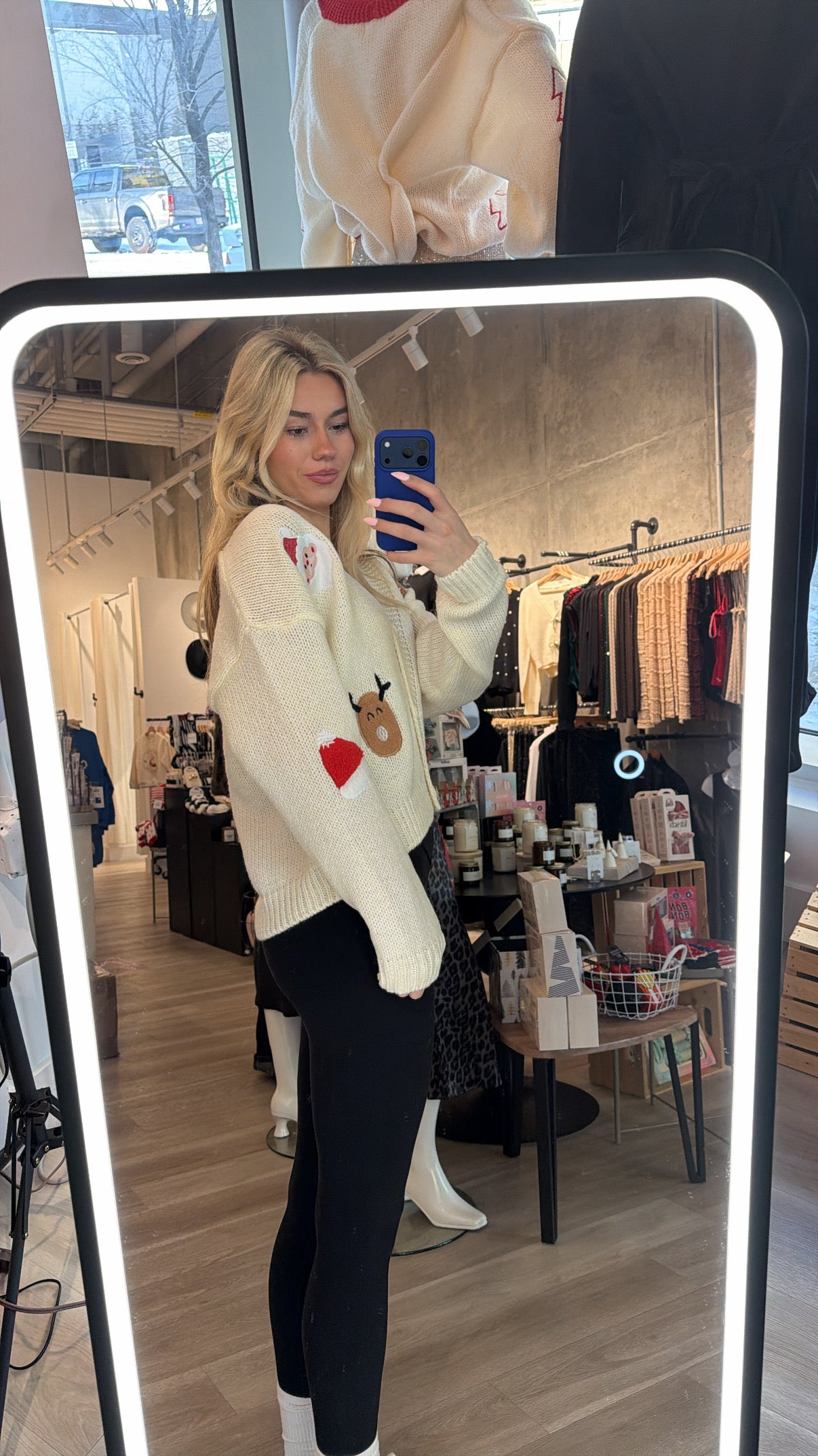 Cozy, whimsical, and effortlessly festive, the Holiday Charm Cardigan is the sweetest way to bring a little magic to your winter wardrobe. This gorgeous ivory cream knit features a functional button down front, a flattering V neckline, and long sleeves with an intentionally relaxed and slightly oversized fit.