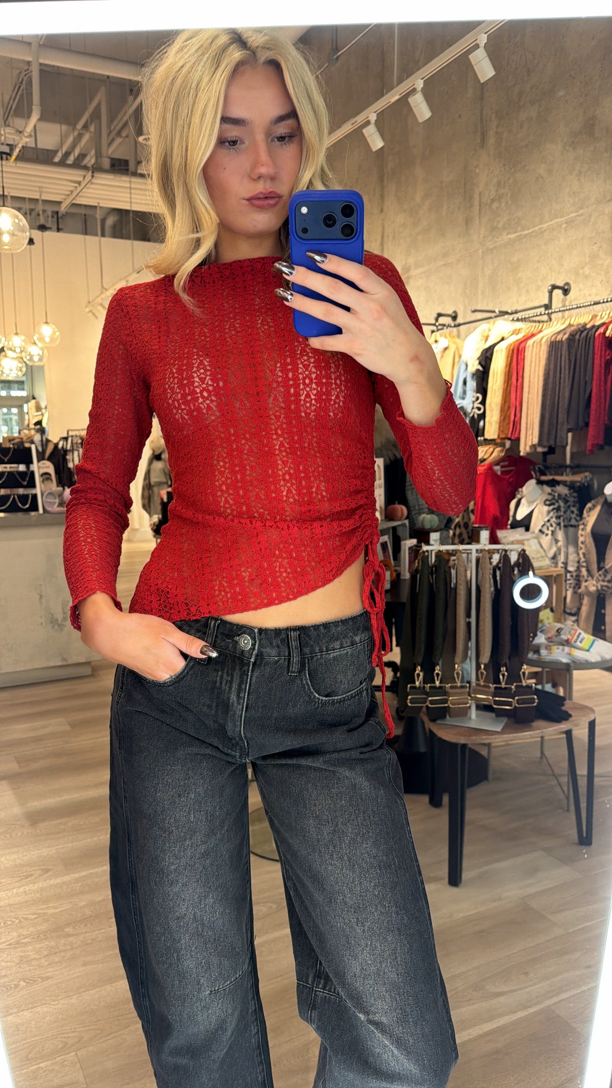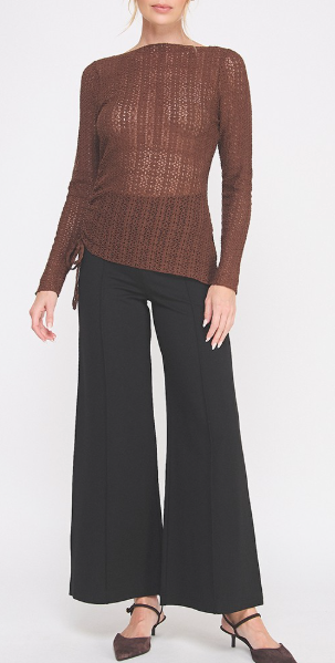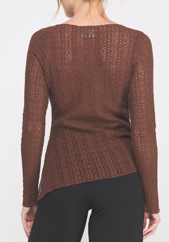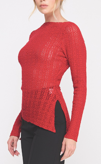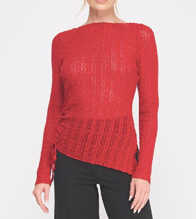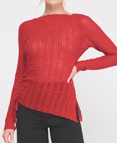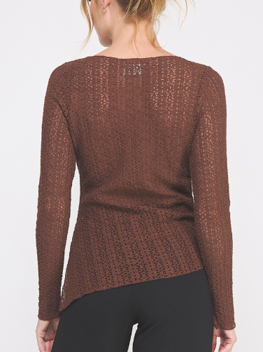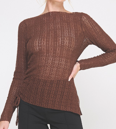 The Karly Lace Top is effortlessly elegant with a touch of edge. Available in deep chocolate brown or dark burnt red, this stunning floral lace top features a flattering boat neckline, V-side slit, and an asymmetrical hemline with a functional tie. Cinch it up for a more dramatic, asymmetrical fit or let it down for a longer, relaxed silhouette. The sheer lace design gives you endless styling options—wear it sexy over a bralette, or layer it with a tank for more coverage. Perfect under a blazer, paired with denim, leather, or a chic skirt, the Karly Lace Top is as versatile as it is beautiful. Avail S - L.