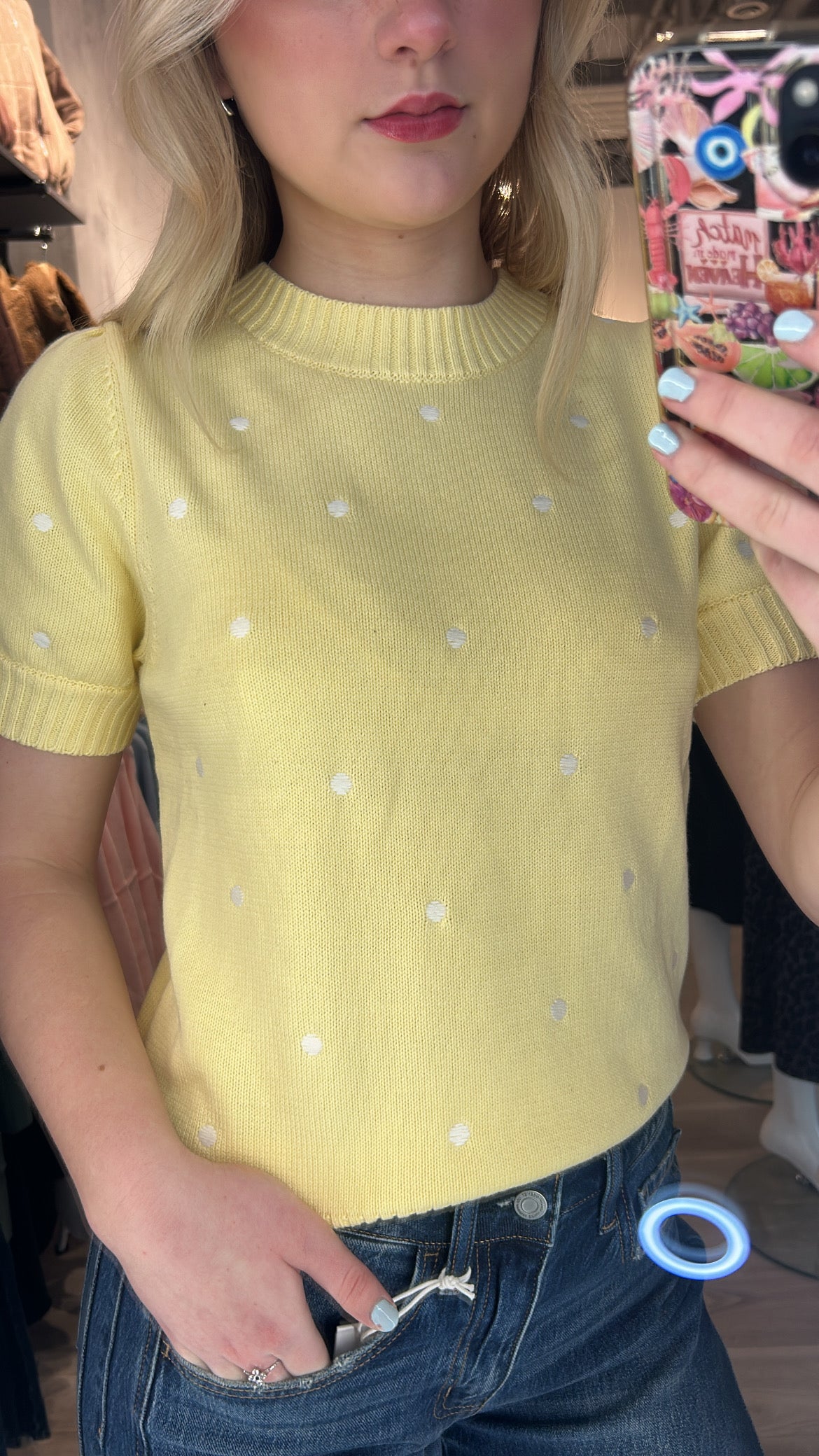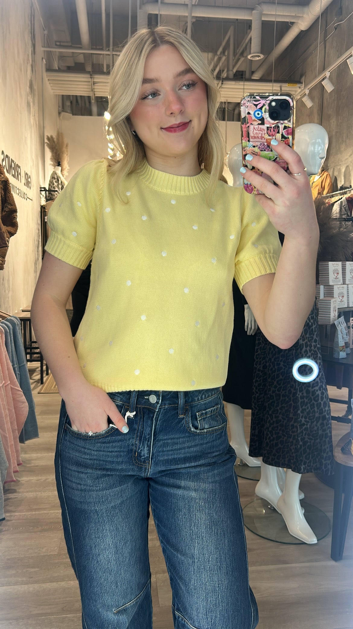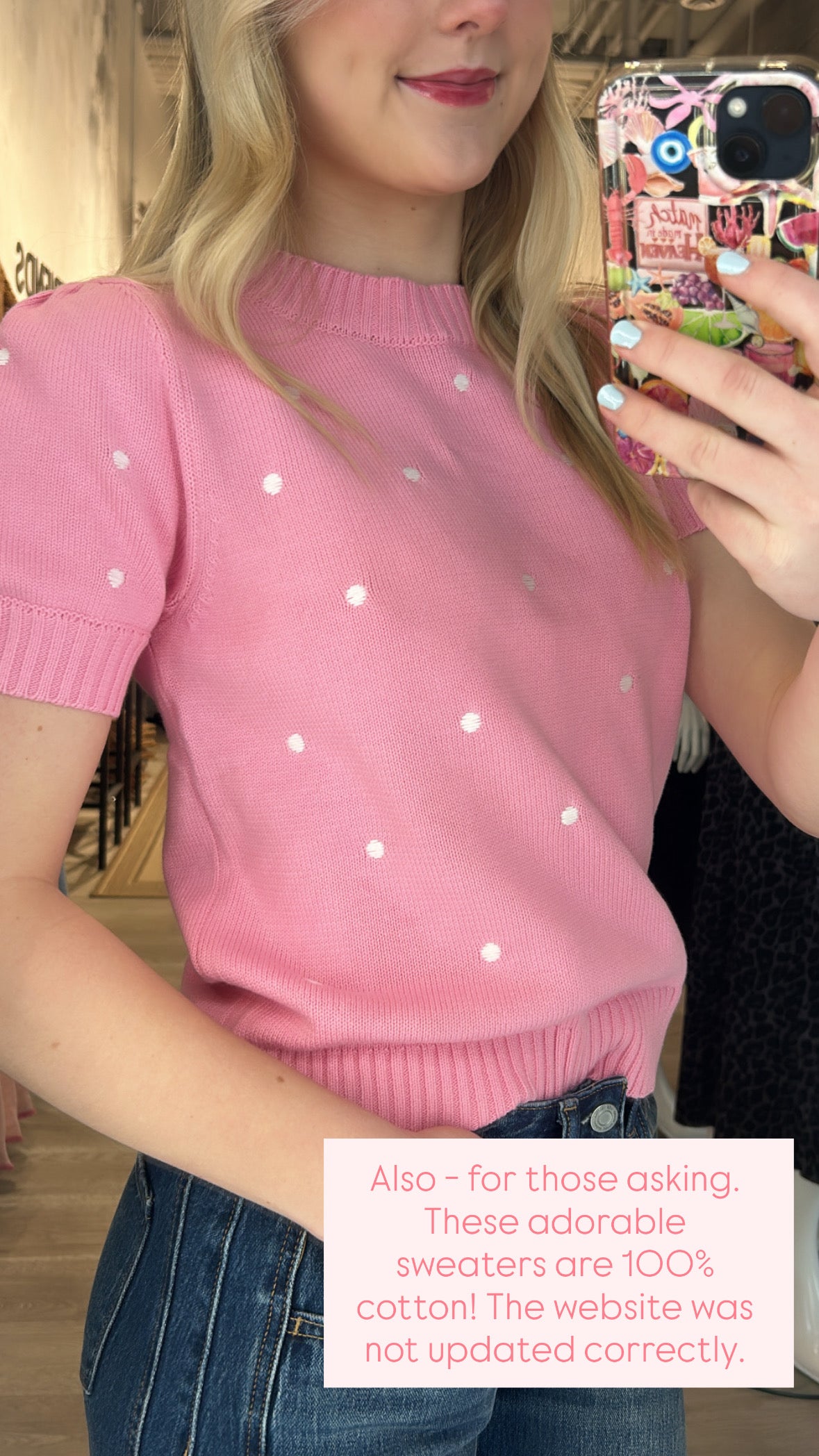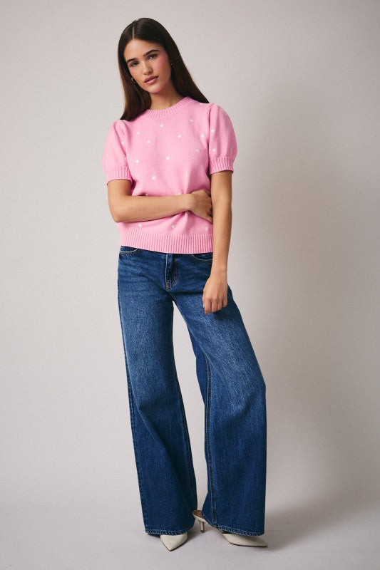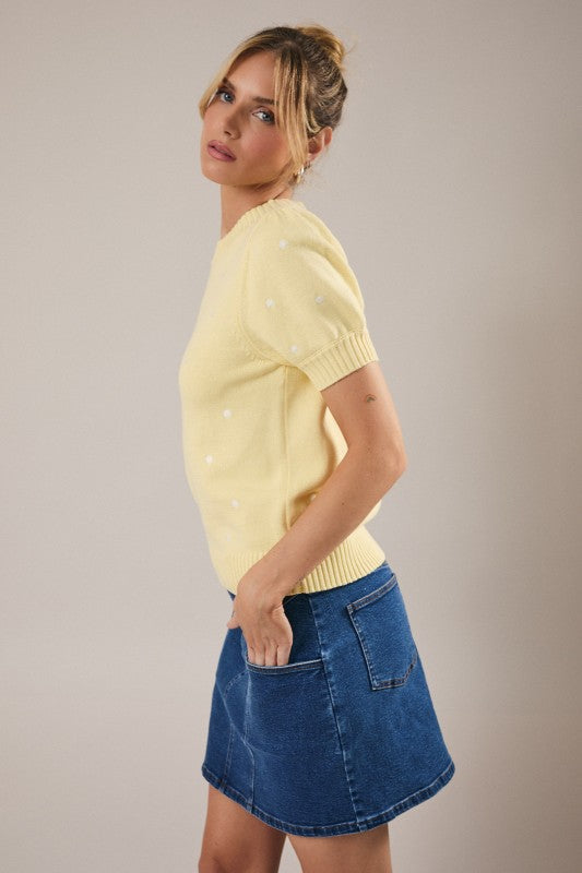 The Pretty in Polka Dot Sweater is pure charm in a cozy knit. Avail in a perfect spring colours light pink, baby blue + soft butter yellow, all sprinkled with sweet white embroidered polka dots for an effortlessly adorable look. It features a classic crew neckline, a softly ripped bottom hem, and the cutest little short sleeves with a subtle puff and cuff detail.