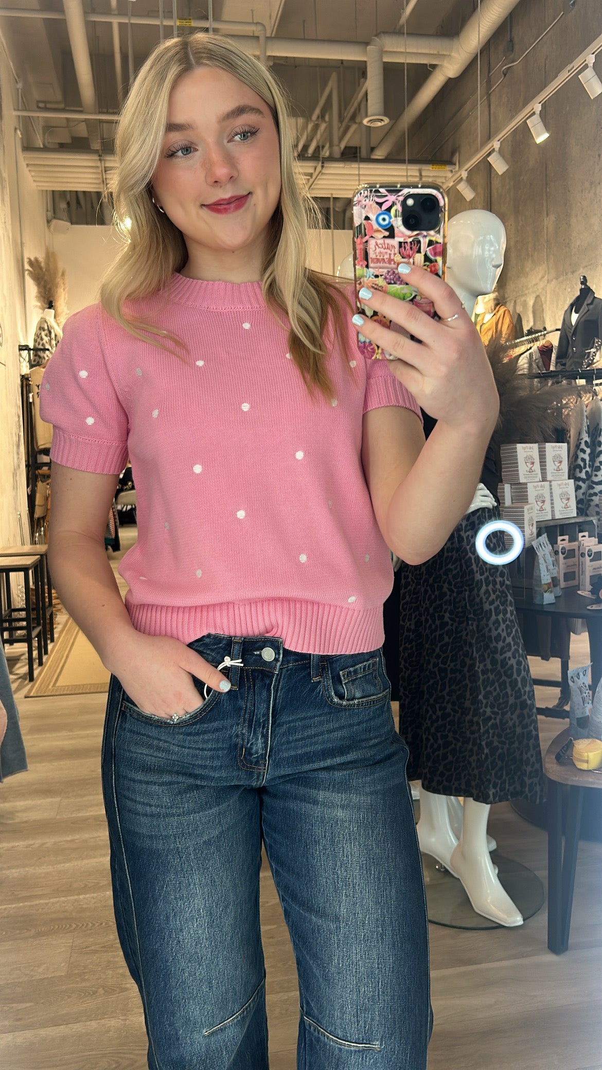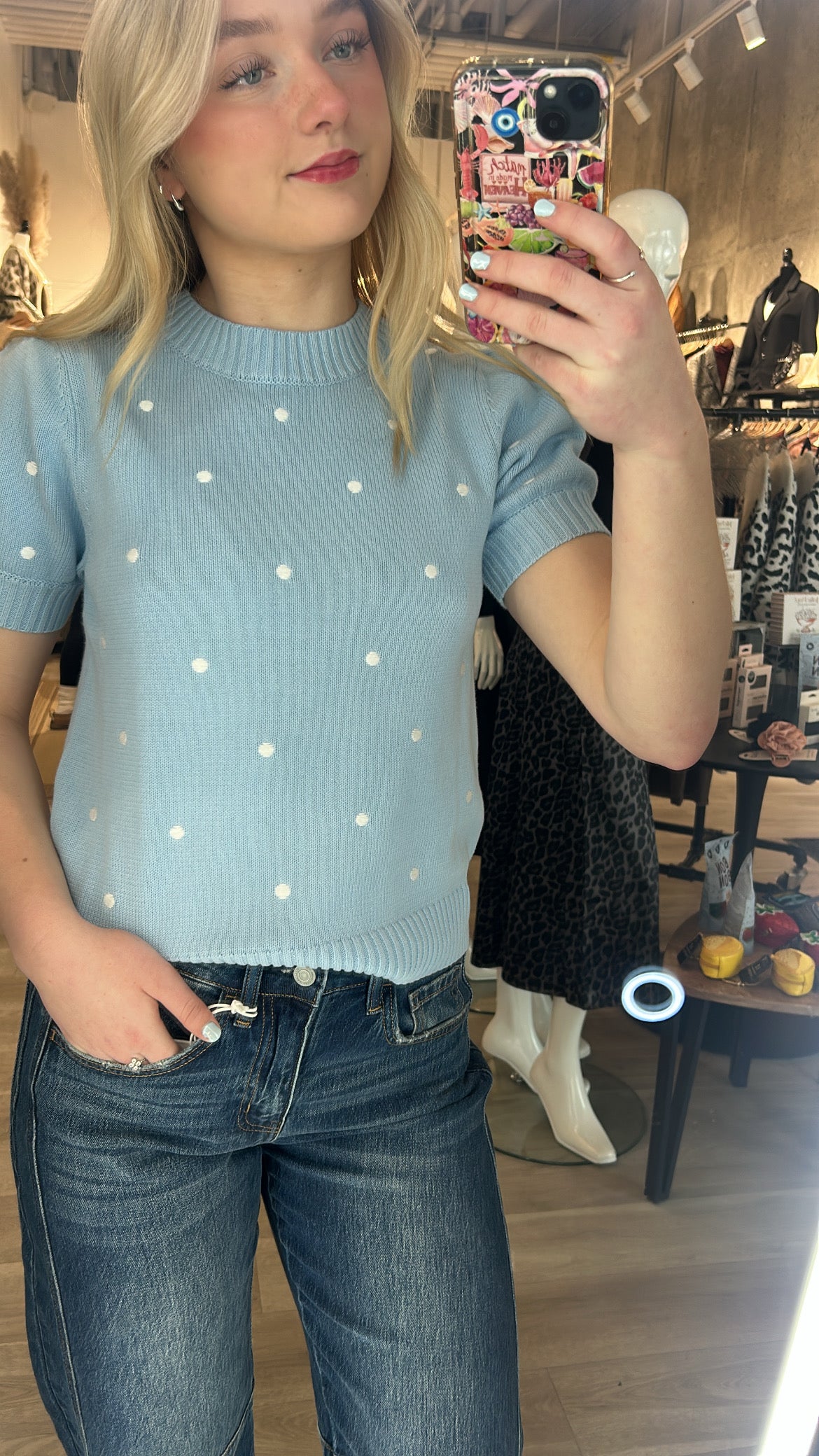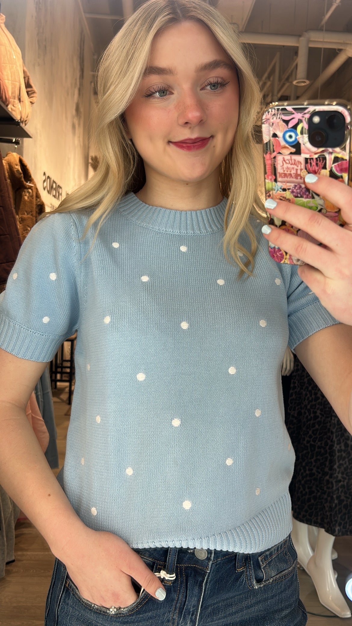The Pretty in Polka Dot Sweater is pure charm in a cozy knit. Avail in a perfect spring colours light pink, baby blue + soft butter yellow, all sprinkled with sweet white embroidered polka dots for an effortlessly adorable look. It features a classic crew neckline, a softly ripped bottom hem, and the cutest little short sleeves with a subtle puff and cuff detail.