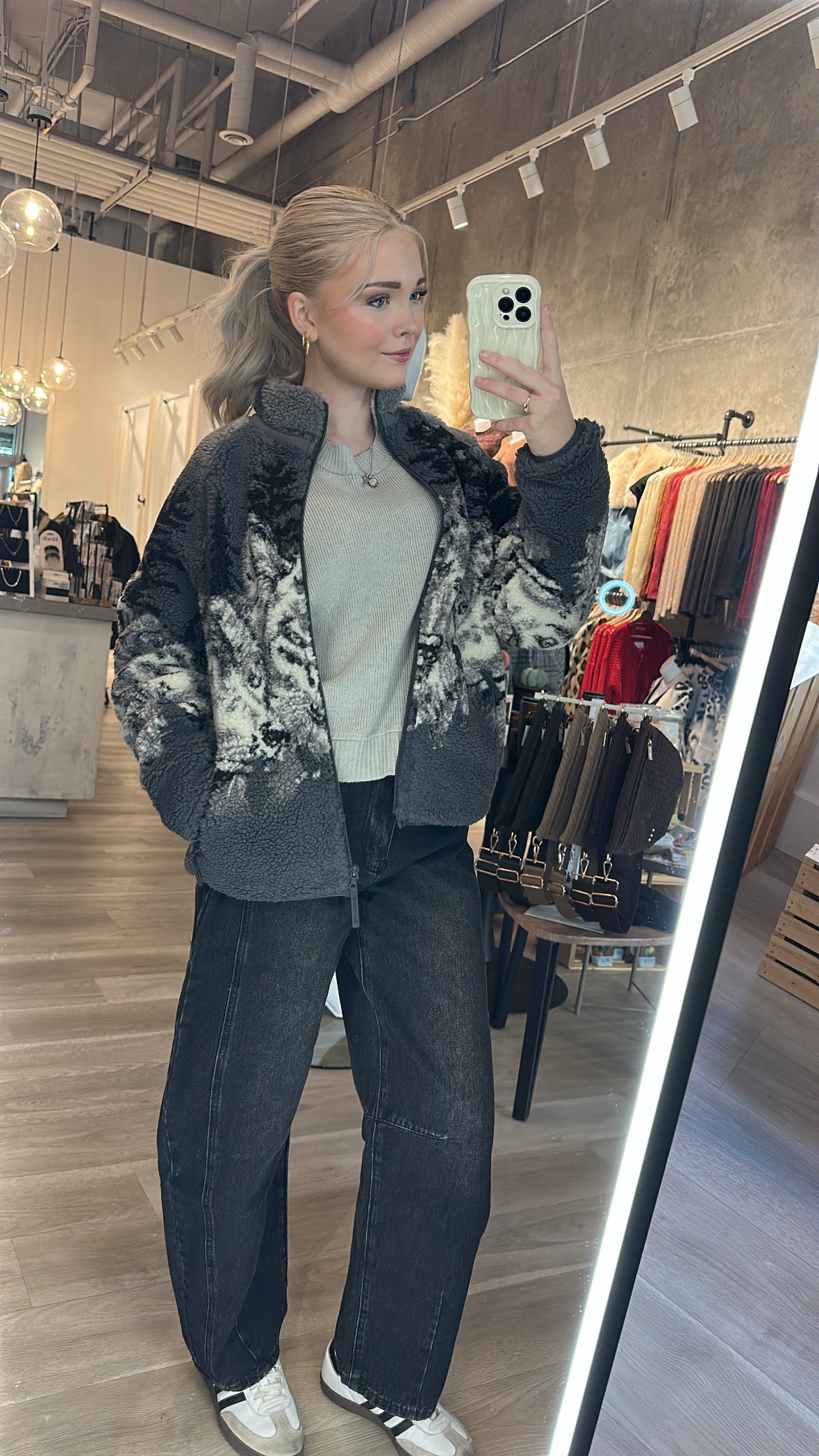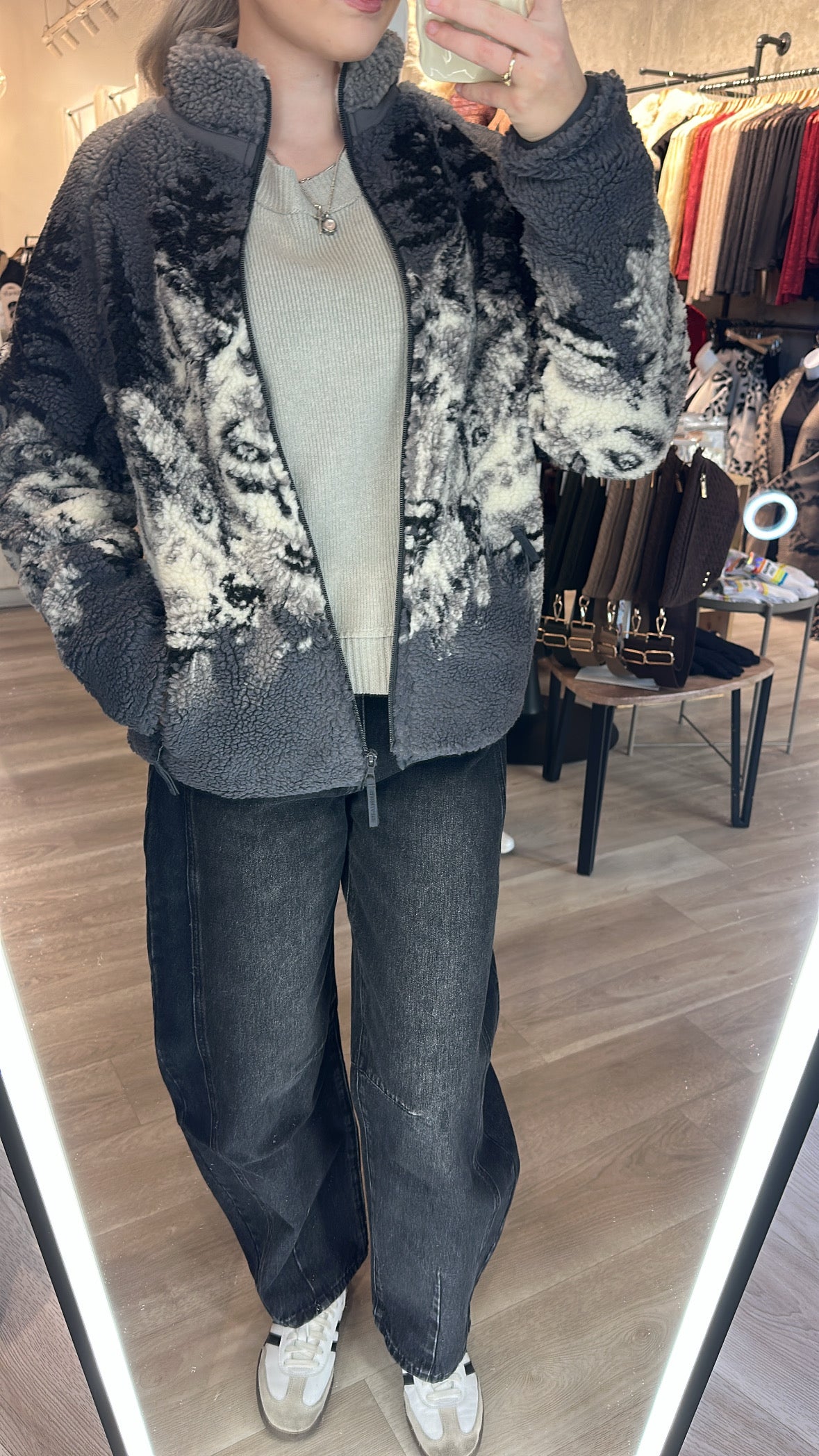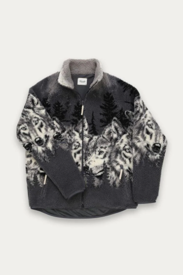 Make a statement on chilly days with the Kuwalla Printed Terry Fleece Jacket. Featuring plush sherpa fleece, this Kuwalla jacket wraps you in warmth while showcasing a bold all over wolf pack motif that draws attention. The full-length zip closure allows for easy temperature control, and the zippered pockets offer space for essentials. A mock neck design enhances coverage and helps keep the cold out, while the relaxed fit ensures comfort throughout the day. Perfect for layering over your go-to outfits, this Kuwalla fleece jacket effortlessly combines coziness with on-trend style. Join the wolf pack with this epic and SUPER warm jacket. The brand Kuwalla is proudly Canadian, based out of Montreal.