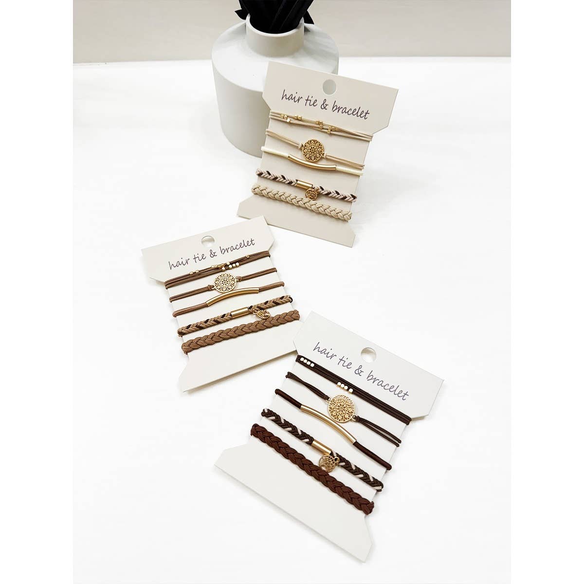 Multi-purpose: Wear as a hair tie or stack as trendy bracelets. 5 per set. Avail in 3 neutrals - dark brown, cream + light mocha.
